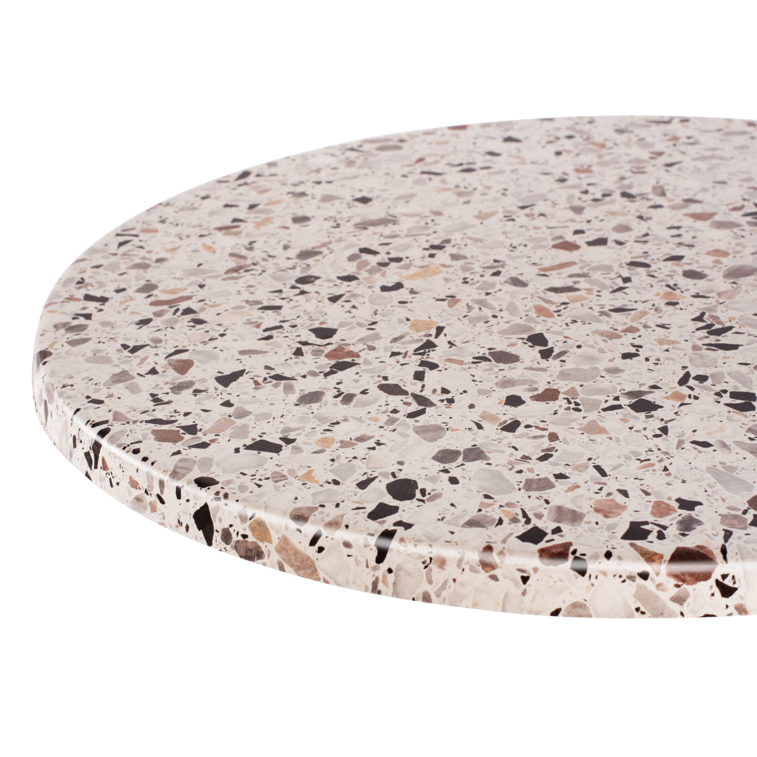 Επαγγελματική στρογγυλή επιφάνεια τραπεζιού σε χρώμα TERRAZZO (σαν μωσαϊκό), η οποία είναι κατάλληλη για επαφή με τρόφιμα και γενικά το υλικό είναι φιλικό προς το περιβάλλον. Μπορεί να χρησιμοποιηθεί σε καφετέριες, εστιατόρια, και τουριστικά καταλύματα, είτε σε εσωτερικούς, είτε σε εξωτερικούς χώρους.