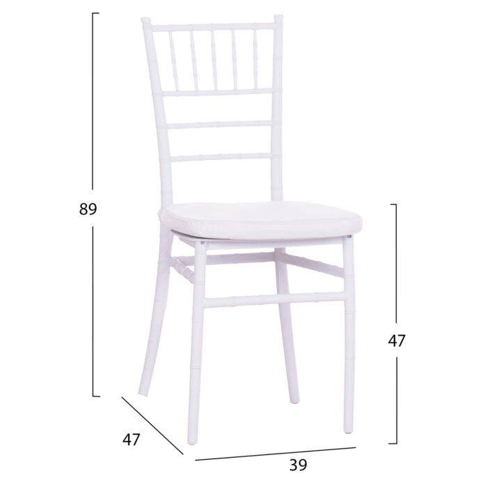 Καρέκλα FB921104 σε λευκό χρώμα με μαξιλάρι καθίσματος. Ιδανική πρόταση για χρήση σε επαγγελματικούς χώρους (χώροι δεξιώσεων, εταιρείες catering, κλπ.). Η καρέκλα διαθέτει λεπτομέρειες τόσο στις οριζόντιες όσο και στις κάθετες δοκούς της πλάτης, αλλά και στα πόδια. Φυσικά, μια τέτοια καρέκλα είναι και ΣΤΟΙΒΑΖΟΜΕΝΗ πράγμα που την κάνει ιδιαιτέρως πρακτική. Το μαξιλάρι καθίσματος δένεται στην καρέκλα με VELCRO (χρατς) ιμάντες, ενώ διαθέτει αναπαυτικό αφρώδες γέμισμα και επένδυση με υδατοαπωθητικό ύφασμα!