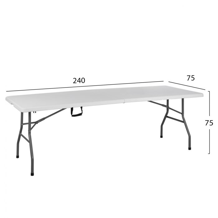 Το FB95681 είναι ένα μακρύ ορθογώνιο τραπέζι με ΛΕΥΚΗ επιφάνεια και ΓΚΡΙ πόδια, ειδικά κατασκευασμένο για εταιρίες catering, για συνεδριακούς χώρους και γενικά για όποιον θέλει ένα ή περισσότερα τραπέζια για πολυπληθείς συγκεντρώσεις χωρίς το άγχος της αποθήκευσης αφού αυτό το τραπέζι είναι πτυσσόμενο και εύκολα μεταφέρεται με την ειδική χειρολαβή που διαθέτει, αφού ο σχεδιασμός του είναι αυτός της «βαλίτσας».