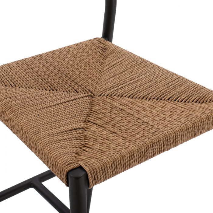 Μοντέρνο σκαμπό bar, κατασκευασμένo από σκελετό αλουμινίου σε ανθρακί απόχρωση, επενδυμένο με πλεκτό ενισχυμένο PE σχοινί στο κάθισμα και στην πλάτη σε μπεζ απόχρωση.