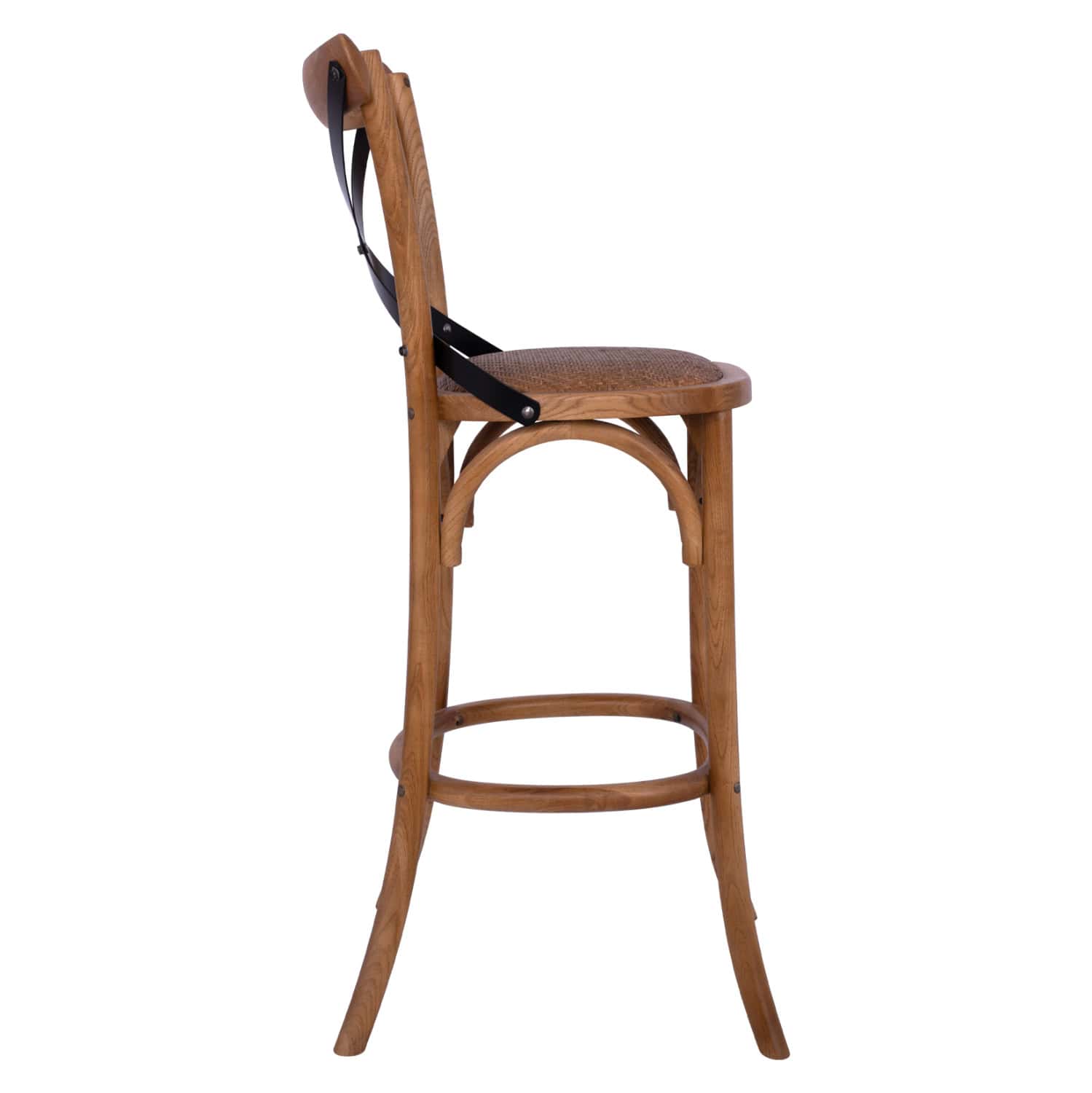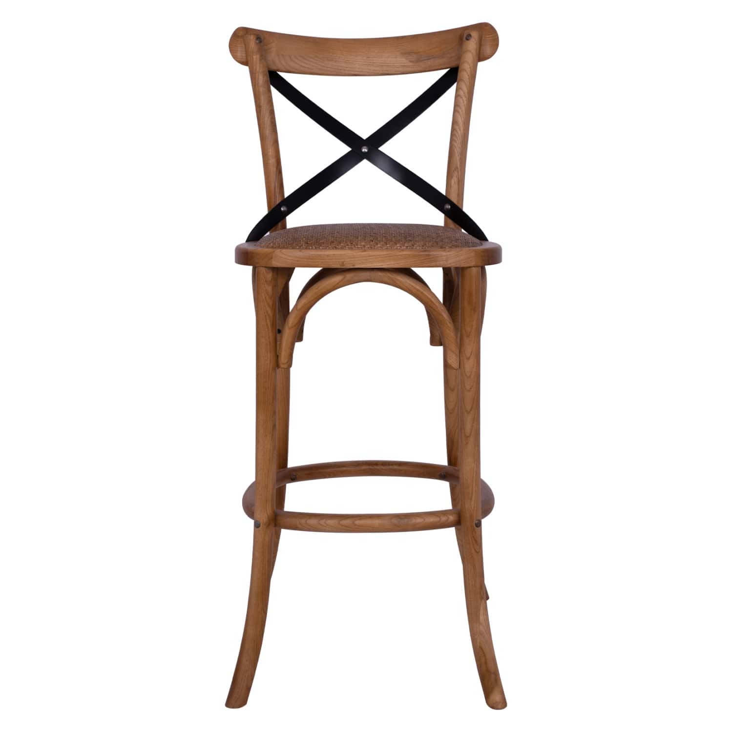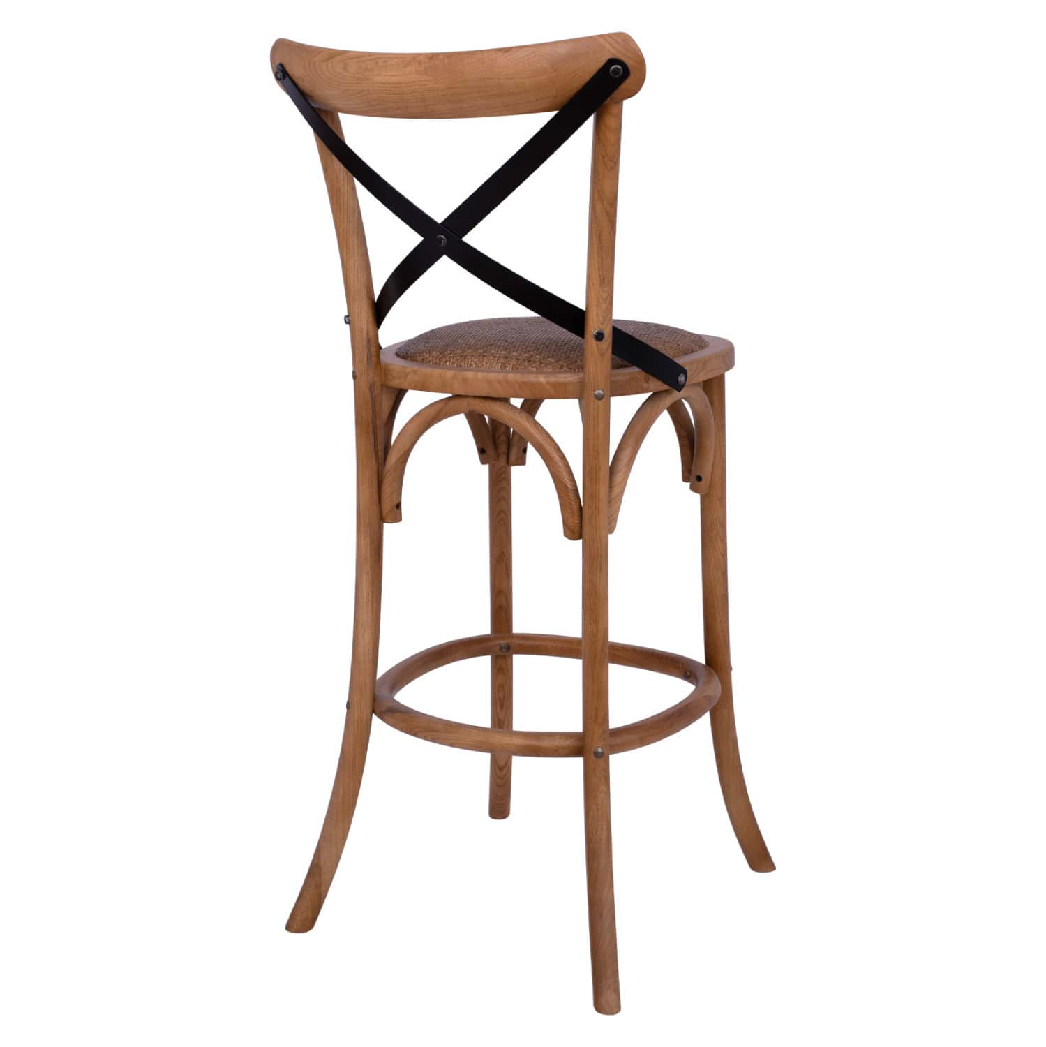 Σκαμπώ Bar ξύλινο υψηλής ποιότητας, με μεταλλικό χιαστί στη πλάτη σε μαύρο χρώμα και κάθισμα από ψάθα.
