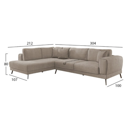 Ο καναπές γωνία FB93144.04L, επενδυμένος με καπιτονέ βελούδινο ύφασμα σε απόχρωση ΒΕΡΑΜΑΝ είναι ελκυστικότατος. Αποτελείται από ένα 3-θέσιο καναπέ κι ένα ανάκλιντρο που «φτιάχνει» την γωνία. Η γωνία αυτή είναι αριστερή και ο καναπές μπορεί να μετατραπεί σε κρεβάτι τραβώντας με τα ειδικά χερούλια το πρόσθετο ράντζο που υπάρχει κάτω από το μεγάλο μέρος του καναπέ. Το κάθισμα είναι άνετο και ευρύχωρο ενώ τα πόδια είναι από πολυαιθυλένιο σε ΜΑΥΡΟ χρώμα.