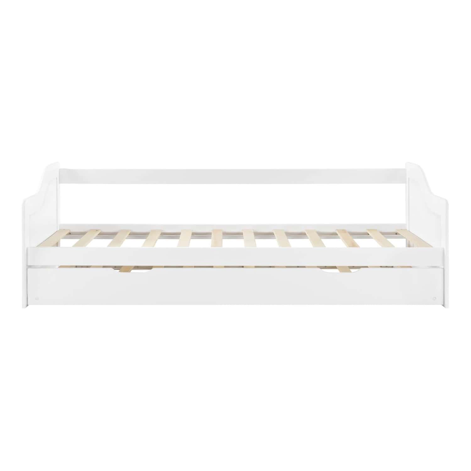 Το FB9704.03 είναι ένα κρεβάτι-καναπές κατασκευασμένο από ξύλο πεύκου σε ΛΕΥΚΟ χρώμα. Έχει χαμηλή πλάτη και όμορφες καμπύλες στα χαμηλά μπράτσα ενώ παίρνει στρώμα σε μονή διάσταση 190×90εκ. Είναι βαμμένο με αβλαβές βερνίκι με βάση το νερό και μη τοξικό, ιδανικό και για παιδιά. Το στρώμα τοποθετείται σε τάβλες κατασκευασμένες από ξυλεία κόντρα πλακέ. Ωστόσο, αυτό που κλέβει τις εντυπώσεις είναι ότι διαθέτει κι ένα δεύτερο κρεβάτι (συρόμενο) με ίδια διάσταση στρώματος που βγαίνει κάτω από τον καναπέ, επιτείνοντας την πρακτικότητά του.