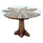 FB99395—Στρογγυλό τραπέζι (ροτόντα) με γυάλινη ενισχυμένη επιφάνεια. Το εντυπωσιακό σε αυτό το τραπέζι είναι ότι αντί για παραδοσιακά πόδια στηρίζεται σε ένα κομμάτι από την κανονική ρίζα του δέντρου. Το αισθητικό αποτέλεσμα είναι όμορφο και είναι αναπόφευκτο να τραβήξει την προσοχή όλων, σε οποιοδήποτε χώρο κι αν τοποθετηθεί! Αποτελεί την επιτομή της ρουστίκ διακόσμησης για τον χώρο που επιθυμείτε.