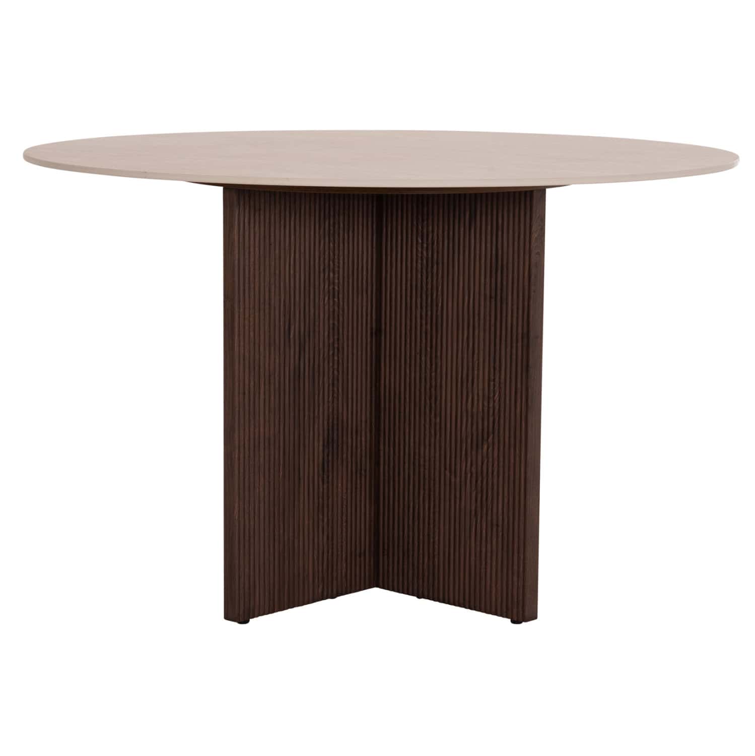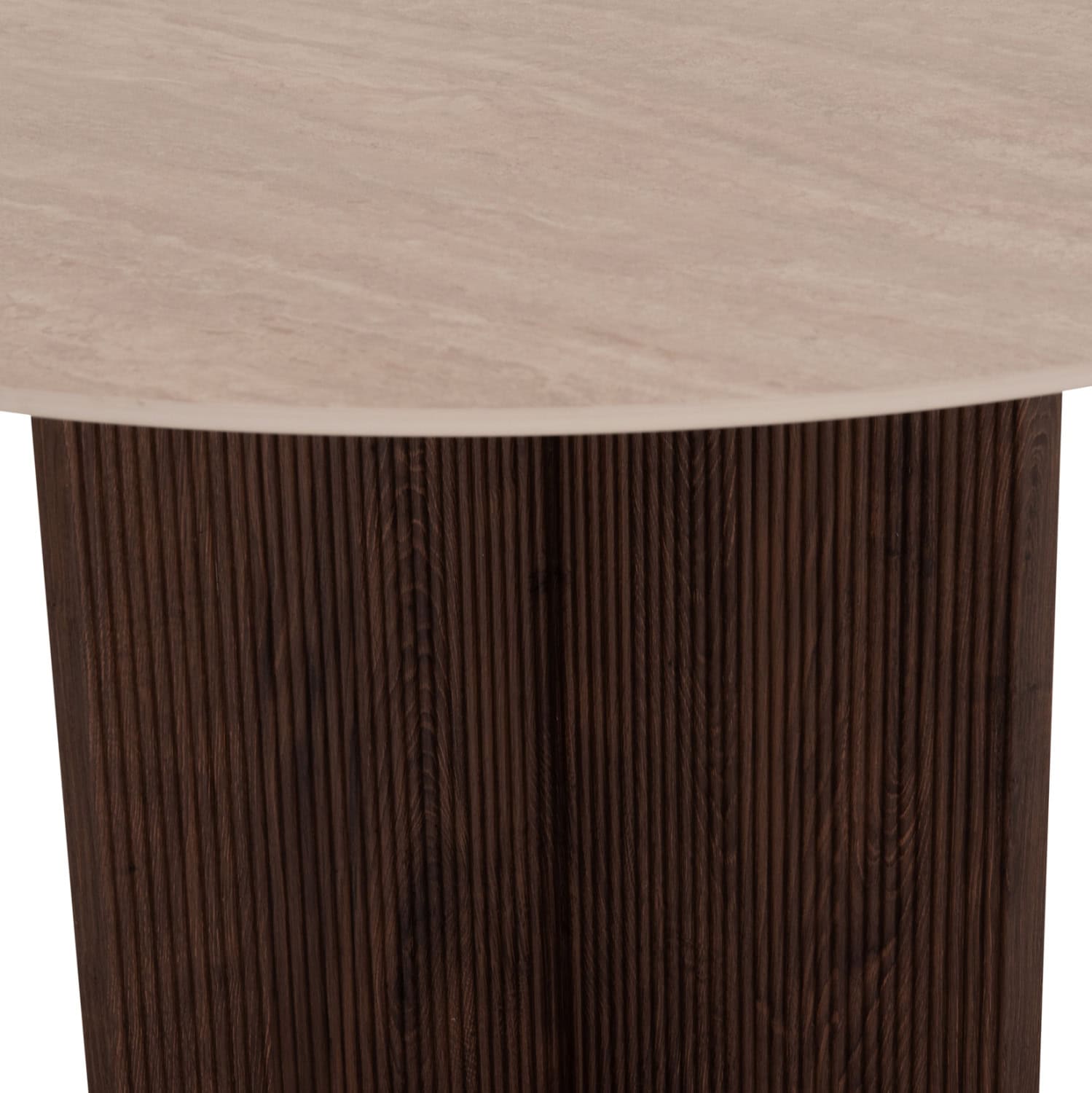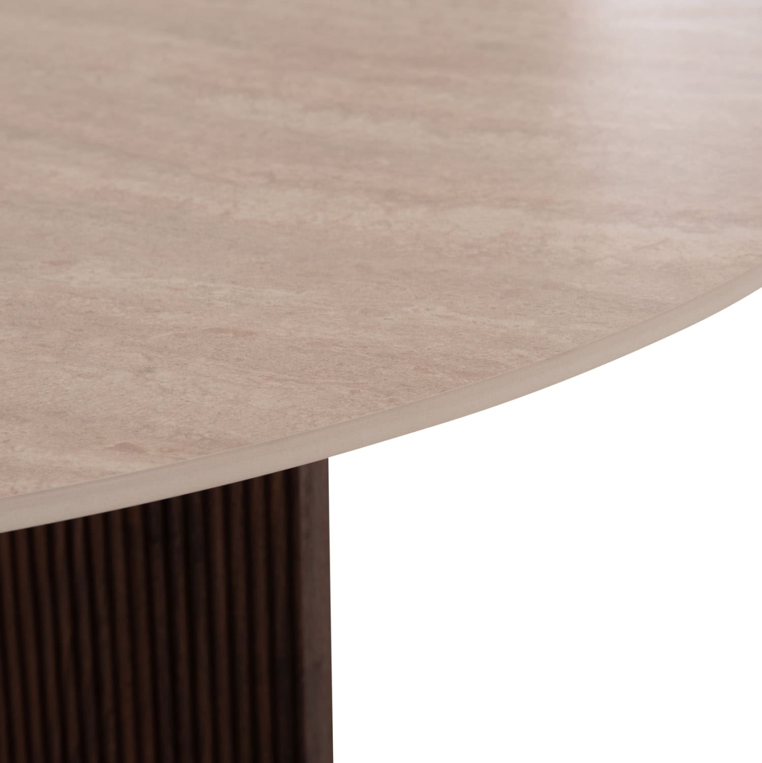 Το τραπέζι τραπεζαρίας FB918331 είναι στρογγυλό και αποτελεί νέα προσθήκη στην γκάμα μας. Η επίπεδη επιφάνειά του είναι κεραμική σε χρωματισμό TRAVERTINE STONE, ενώ η βάση του είναι σταυρωτή κατασκευασμένη εξολοκλήρου από MDF σε καφέ χρώμα, με όμορφες πτυχώσεις.