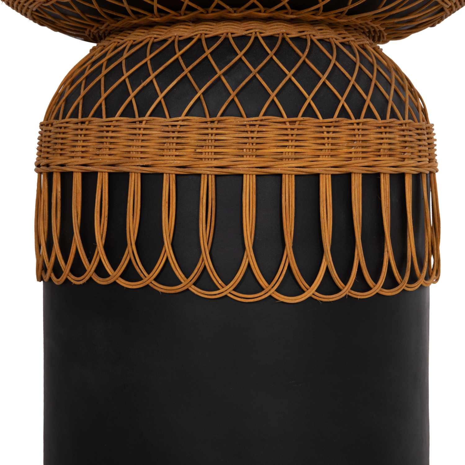 Το χειροποίητο ψηλό βοηθητικό τραπέζι FB918159.01 αποτελεί σημείο αναφοράς σε κάθε χώρο με το όμορφο design του αλλά και την πολύ ιδιαίτερη διακόσμησή του με φυσικό rattan. Είναι κατασκευασμένο εξολοκλήρου από Fiber Cement σε ΜΑΥΡΟ χρώμα και ενδείκνυται τόσο για το σπίτι, όσο και για επαγγελματικούς χώρους, όπως ξενοδοχεία, AirBnB, κτλ., με αντίστοιχη αισθητική.