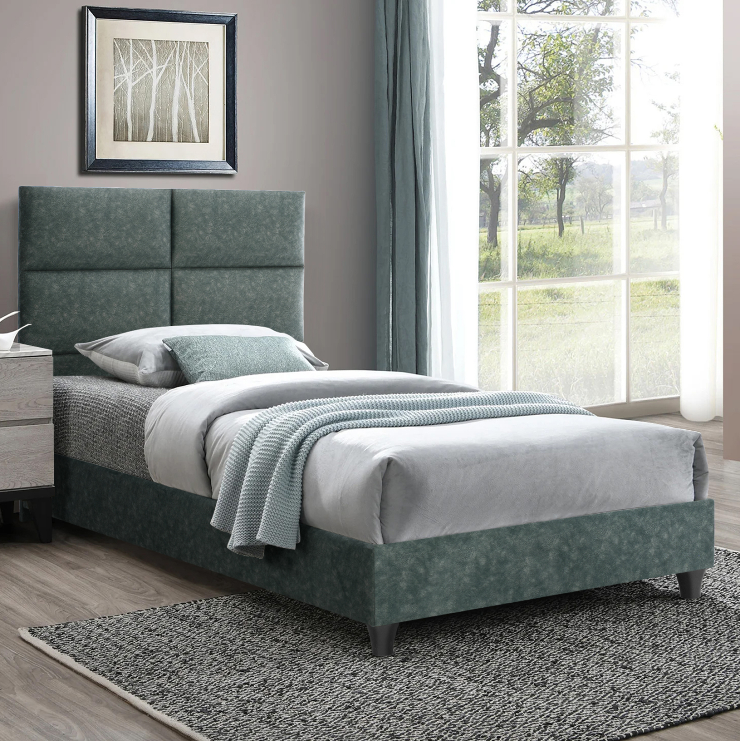 Το κρεβάτι αυτό έχει ψηλό κεφαλάρι, επενδυμένο με καπιτονέ τεχνοτροπία σε μεγάλα ορθογώνια, ενώ και όλη η επένδυση του κρεβατιού είναι από ανάγλυφο ύφασμα τύπου NUBUCK. Το ΠΡΑΣΙΝΟ χρώμα σε όλο το κρεβάτι είναι όμορφο και μπορεί να συνδυαστεί με πληθώρα διακοσμητικών μοτίβων.