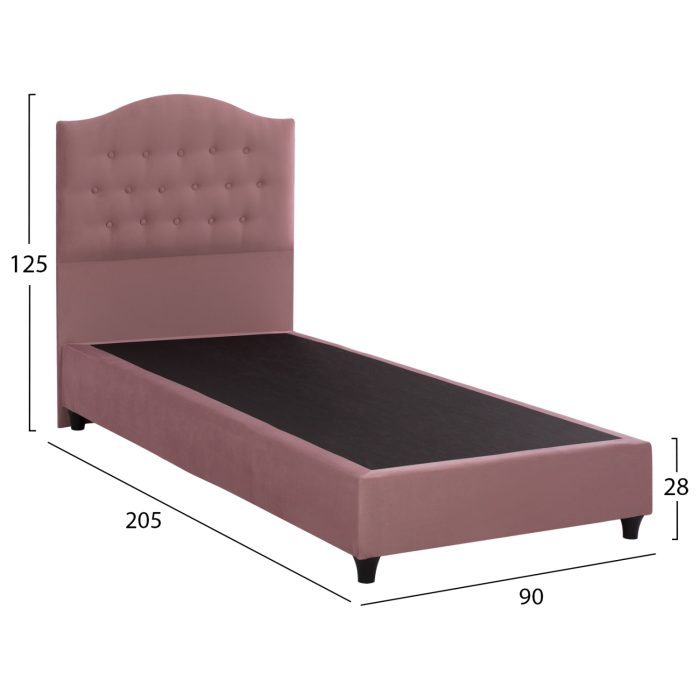 Το κρεβάτι αυτό έχει ψηλό κεφαλάρι, επενδυμένο με καπιτονέ τεχνοτροπία με τρούκς, ενώ και όλη η επένδυση του κρεβατιού είναι από βελούδινο ύφασμα. Το ΣΑΠΙΟ ΜΗΛΟ χρώμα σε όλο το κρεβάτι είναι ουδέτερο και μπορεί να συνδυαστεί με πληθώρα διακοσμητικών μοτίβων. Όμως, το κύριο χαρακτηριστικό αυτού του κρεβατιού είναι ότι δεν ακολουθεί την κλασική κατασκευή με τις τάβλες του σομιέ για την στήριξη του στρώματος, αλλά αντίθετα αποτελείται από μια συνεχόμενη επιφάνεια (2 μοριοσανίδες) επενδυμένη με αντιολισθητική φόδρα, πάνω στην οποία τοποθετείται το στρώμα. Σε διαστάσεις μονού στρώματος 90×200 εκ. ένα άτομο θα χωρέσει άνετα!