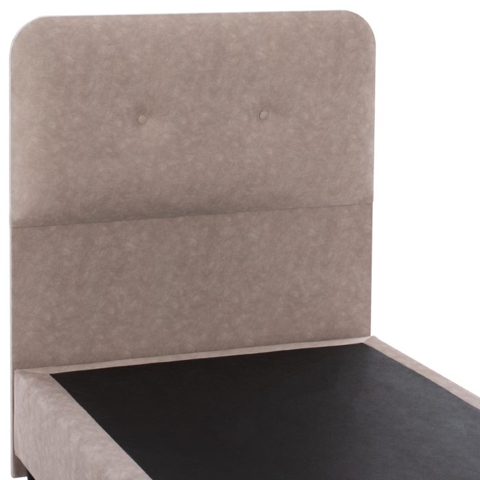 Το κρεβάτι αυτό έχει ψηλό κεφαλάρι, και έχει διακόσμηση με 2 μόνο τρουκς (κουμπάκια), ενώ και όλη η επένδυση του κρεβατιού είναι από ανάγλυφο ύφασμα τύπου NUBUCK. Το ΜΠΕΖ χρώμα σε όλο το κρεβάτι είναι ουδέτερο και μπορεί να συνδυαστεί με πληθώρα διακοσμητικών μοτίβων. Όμως, το κύριο χαρακτηριστικό αυτού του κρεβατιού είναι ότι δεν ακολουθεί την κλασική κατασκευή με τις τάβλες του σομιέ για την στήριξη του στρώματος, αλλά αντίθετα αποτελείται από μια συνεχόμενη επιφάνεια πάνω στην οποία τοποθετείται το στρώμα! Σε διαστάσεις μονού στρώματος 90×200 εκ.