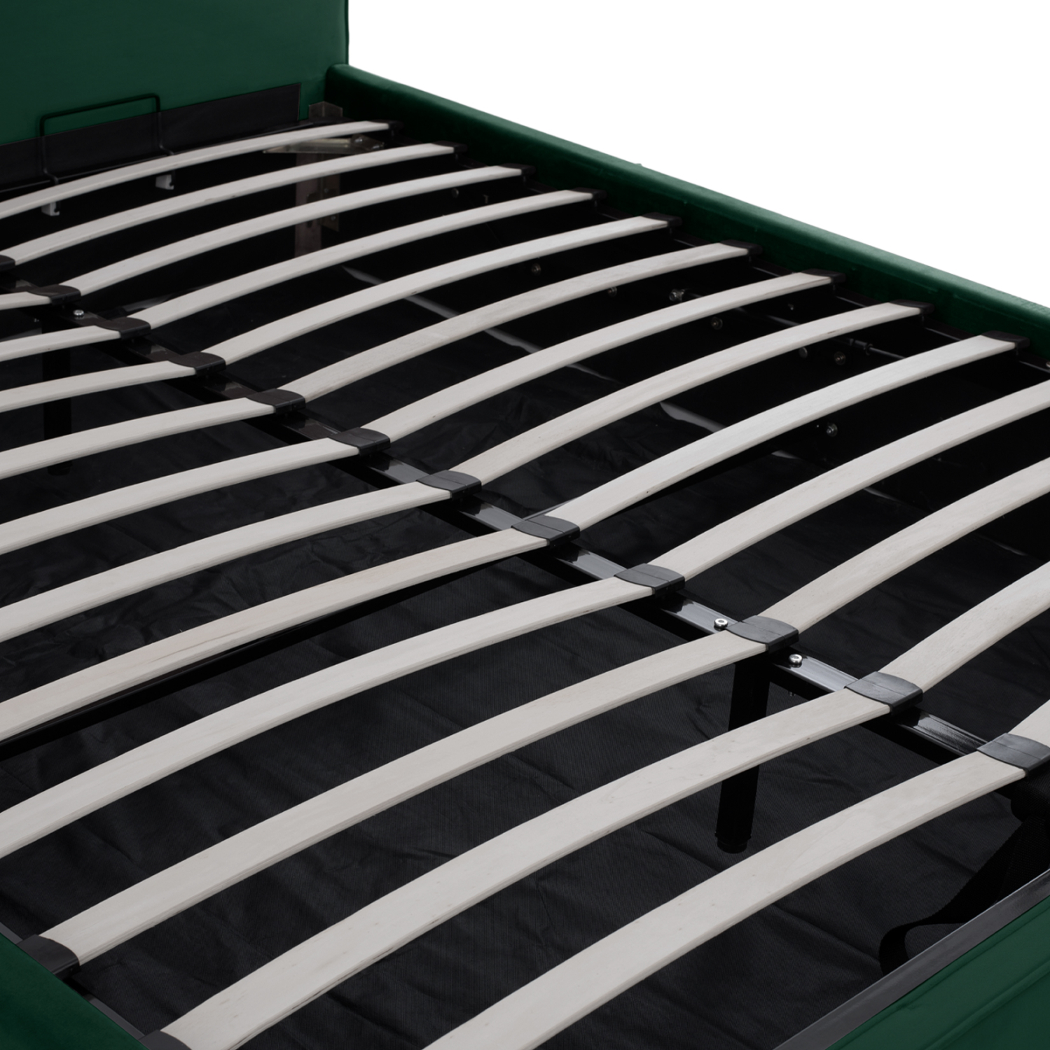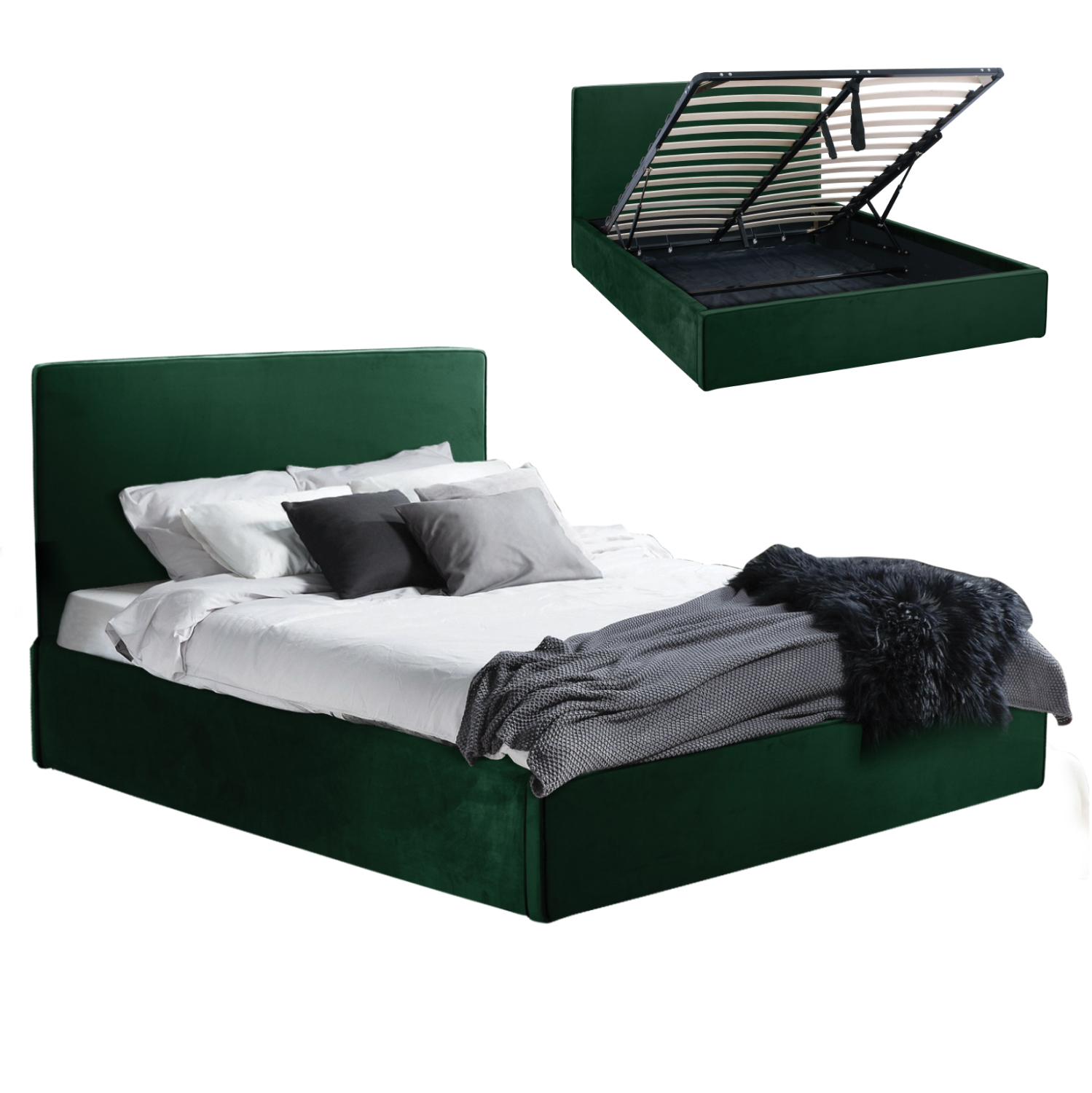 Εμείς λοιπόν, σας προσφέρουμε το κρεβάτι αυτό για να απολαμβάνετε κάθε στιγμή τον ύπνο σας. Σε διάσταση για στρώμα 160×200 εκ, είναι επαρκές για να χωρέσουν δύο άτομα. Έχει ψηλό κεφαλάρι με βελούδινη επένδυση σε κυπαρισσί χρώμα ενώ ένα ρέλι σε ίδιο χρώμα διατρέχει όλες τις άκρες του κρεβατιού. Το στρώμα «κάθεται» πάνω σε δύο σειρές από ανατομικές τάβλες, ακολουθώντας τον παραδοσιακό τρόπο κατασκευής κρεβατιού. Ωστόσο, το κύριο χαρακτηριστικό αυτού του κρεβατιού είναι ότι διαθέτει αποθηκευτικό χώρο κάτω από τις τάβλες του στρώματος που εφαρμόζουν σε έναν μεταλλικό μηχανισμό, ο οποίος ανασηκώνεται με έναν ιμάντα. Μια μοντέρνα και λιτή πρόταση που θα ανανεώσει το υπνοδωμάτιό σας.