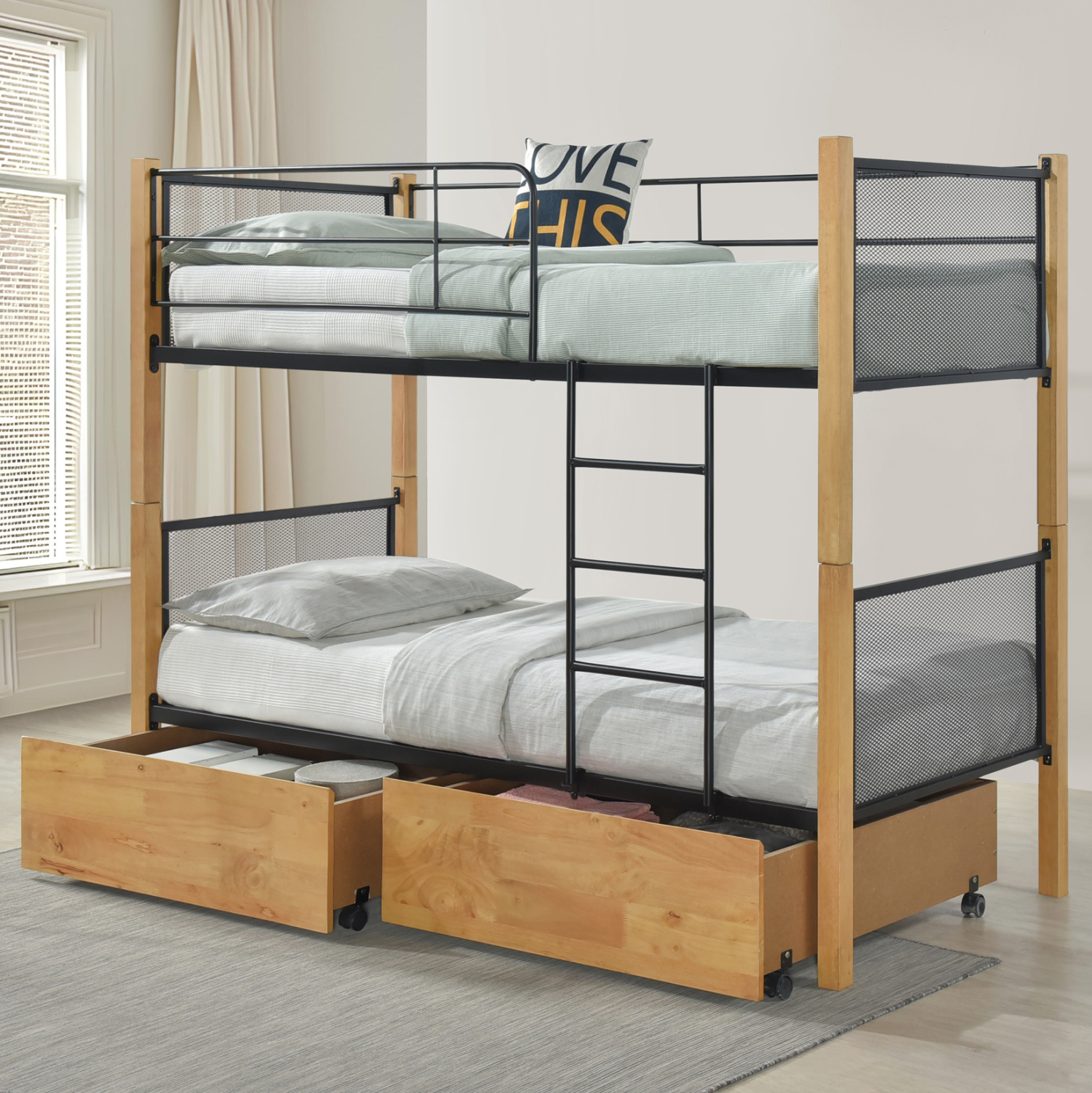 Σας παρουσιάζουμε τo κρεβάτι-κουκέτα FB921119.02 σε συνδυασμό ξύλου- μετάλλου για μονά στρώματα 90×190εκ. Τα 4 πόδια-κολώνες του κρεβατιού είναι τα ξύλινα κομμάτια της σύνθεσης σε χρώμα ΟΞΙΑΣ, ενώ το κεφαλάρι, το ποδαρικό, τα πλαϊνά, η σκάλα, τα κάγκελα, και οι τάβλες στήριξης του στρώματος είναι όλα μεταλλικά σε ΜΑΥΡΟ χρώμα. Τα κεφαλάρια μάλιστα αποτελούνται από μεταλλική «σίτα», όπως και τα ποδαρικά. Η πρόσβαση στο επάνω κρεβάτι γίνεται με μια μεταλλική σκάλα που τοποθετείται βιδωτή στον σκελετό. Στο επάνω κρεβάτι υπάρχουν πλαϊνά προστατευτικά κάγκελα που προσφέρουν ασφάλεια από πτώσεις. Η πρακτικότητά του τονίζεται ακόμα περισσότερο χάρη στα δύο συρτάρια δαπέδου με ροδάκια, που τοποθετούνται κάτω από το κρεβάτι, και διαθέτουν όμορφη πρόσοψη μελαμίνης σε χρώμα παρόμοιο με τον σκελετό του κρεβατιού. Ιδανικό τόσο για το σπίτι, όσο και για επαγγελματικούς χώρους, όπως AirBnB, ξενοδοχεία κτλ.