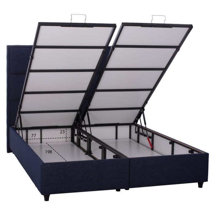 Μια παλιά Ιρλανδέζικη παροιμία λέει ότι «Το γέλιο και ο ύπνος είναι τα καλύτερα φάρμακα του κόσμου». Εμείς, γέλιο δεν είναι η δουλειά μας να προσφέρουμε, αλλά σίγουρα μπορούμε να σας εξασφαλίσουμε τον καλό ύπνο! Με το κρεβάτι αυτό δεν θα ζητήσετε ποτέ κάτι άλλο. Το κεφαλάρι είναι ψηλό και επενδυμένο με τετραγωνισμένη καπιτονέ τεχνοτροπία, ενώ και όλη η επένδυση του κρεβατιού είναι από εξαιρετικής ποιότητας ύφασμα. Το μπλε χρώμα σε όλο το κρεβάτι είναι εντυπωσιακό και μπορεί να συνδυαστεί με πληθώρα διακοσμητικών μοτίβων. Όμως, το κύριο χαρακτηριστικό αυτού του κρεβατιού είναι ότι δεν ακολουθεί την κλασική κατασκευή με τις τάβλες του σομιέ για την στήριξη του στρώματος, αλλά αντίθετα αποτελείται από μια συνεχόμενη επιφάνεια (2 μοριοσανίδες) πάνω στην οποία τοποθετείται το στρώμα. Επιπλέον, η κάθε επιφάνεια από μοριοσανίδα ανασηκώνεται με μεταλλικό μηχανισμό ασφαλείας με 4 αμορτισέρ και μεταλλικές λαβές προσφέροντας έναν μεγάλο αποθηκευτικό χώρο. Σε διαστάσεις στρώματος 160×200 εκ. θα χωρέσει κάθε σας όνειρο!