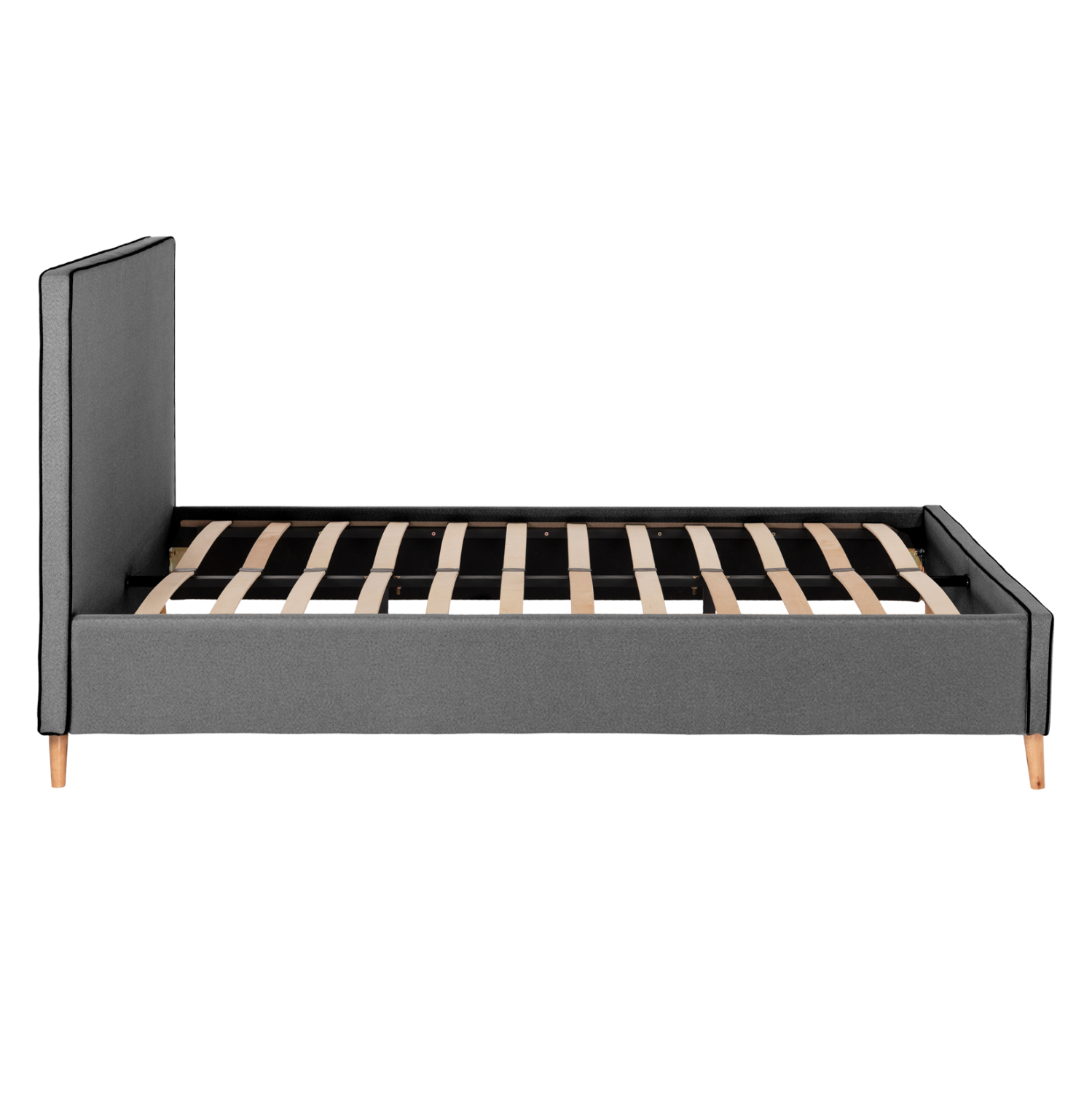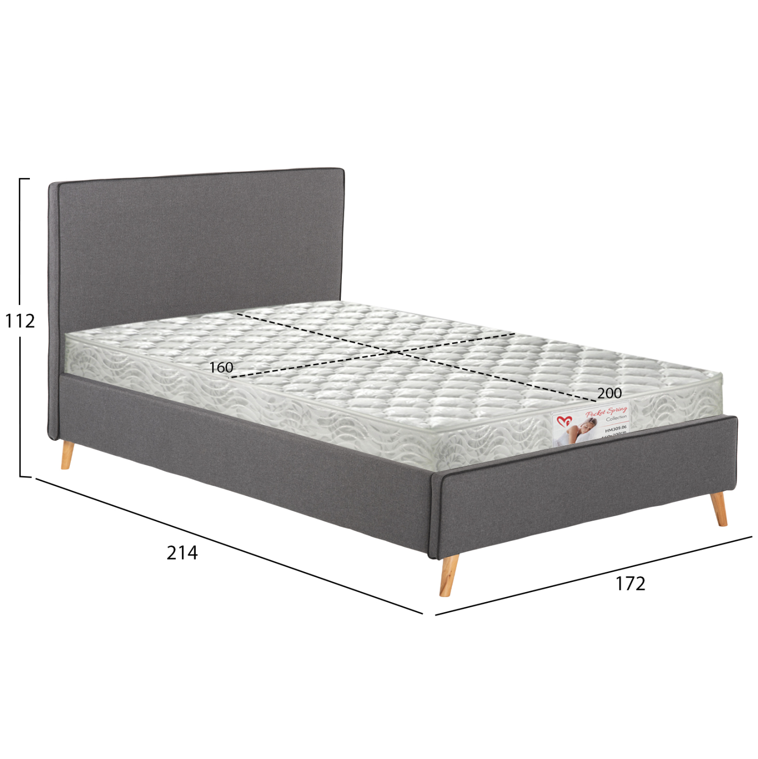 Το υπέρδιπλο κρεβάτι FB921280.01 είναι επενδυμένο με ύφασμα σε χρώμα ΓΚΡΙ με σκούρο ρέλι στις ραφές. Το στρώμα που συνοδεύει το κρεβάτι τοποθετείται σε δύο σειρές ανατομικές τάβλες, είναι διπλής όψης και έχει τεχνολογία με pocket springs (ανεξάρτητα ελατήρια). Τα πόδια είναι ξύλινα σε φυσικό χρώμα.