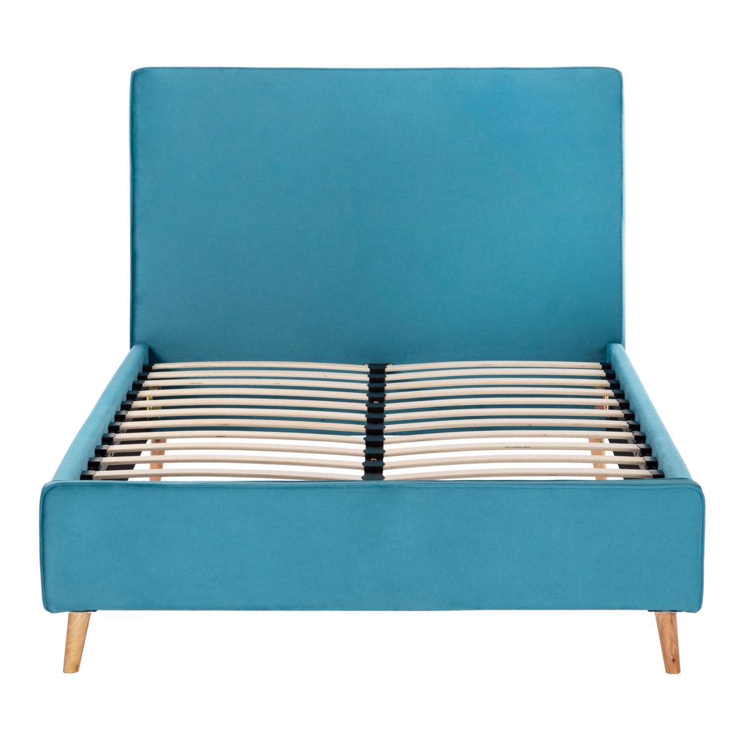 Το ημίδιπλο κρεβάτι FB921281.02 είναι επενδυμένο με βελούδο σε χρώμα ΤΙΡΚΟΥΑΖ. Το στρώμα (διατίθεται σε ROLL-PACKING*) που συνοδεύει το κρεβάτι τοποθετείται σε δύο σειρές ανατομικές τάβλες, είναι διπλής όψης και είναι ΑΦΡΟΥ χωρίς ελατήρια. Τα πόδια είναι ξύλινα σε φυσικό χρώμα.