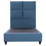Το κρεβάτι αυτό έχει ψηλό κεφαλάρι, επενδυμένο με καπιτονέ τεχνοτροπία σε μεγάλα ορθογώνια, ενώ και όλη η επένδυση του κρεβατιού είναι από βελούδινο ύφασμα. Το ΜΠΛΕ χρώμα σε όλο το κρεβάτι είναι εντυπωσιακό και μπορεί να συνδυαστεί με πληθώρα διακοσμητικών μοτίβων. Όμως, το κύριο χαρακτηριστικό αυτού του κρεβατιού είναι ότι δεν ακολουθεί την κλασική κατασκευή με τις τάβλες του σομιέ για την στήριξη του στρώματος, αλλά αντίθετα αποτελείται από μια συνεχόμενη επιφάνεια (μοριοσανίδα) πάνω στην οποία τοποθετείται το στρώμα! Σε διαστάσεις μονού στρώματος 90×200 εκ.