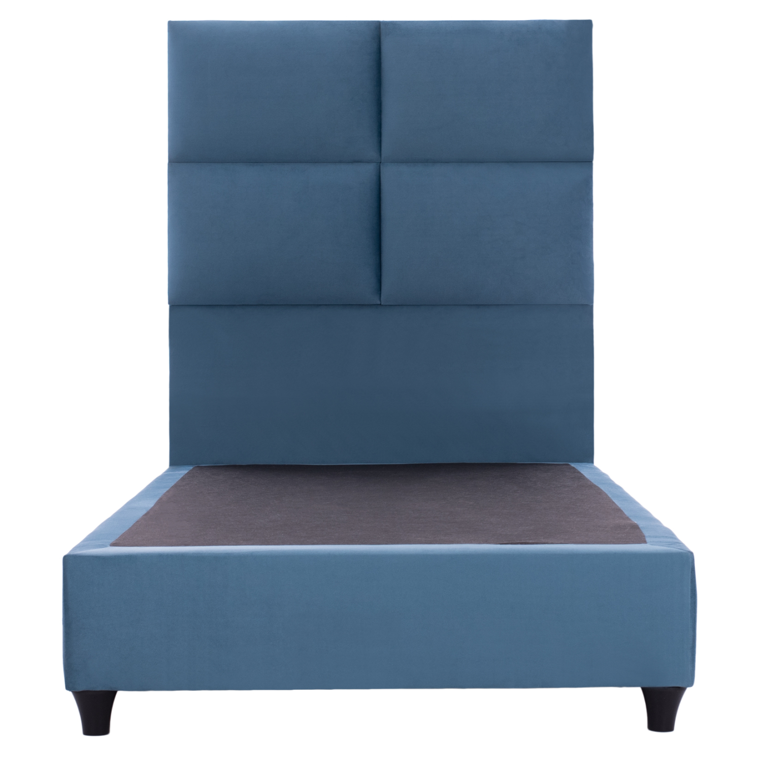 Το κρεβάτι αυτό έχει ψηλό κεφαλάρι, επενδυμένο με καπιτονέ τεχνοτροπία σε μεγάλα ορθογώνια, ενώ και όλη η επένδυση του κρεβατιού είναι από βελούδινο ύφασμα. Το ΜΠΛΕ χρώμα σε όλο το κρεβάτι είναι εντυπωσιακό και μπορεί να συνδυαστεί με πληθώρα διακοσμητικών μοτίβων. Όμως, το κύριο χαρακτηριστικό αυτού του κρεβατιού είναι ότι δεν ακολουθεί την κλασική κατασκευή με τις τάβλες του σομιέ για την στήριξη του στρώματος, αλλά αντίθετα αποτελείται από μια συνεχόμενη επιφάνεια (μοριοσανίδα) πάνω στην οποία τοποθετείται το στρώμα! Σε διαστάσεις μονού στρώματος 90×200 εκ.