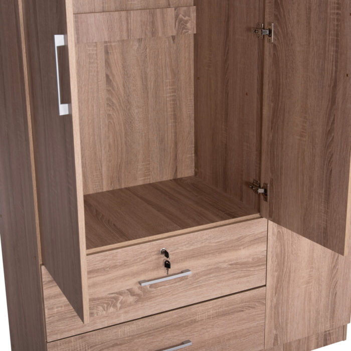 Η τρίφυλλη ντουλάπα FB92485.11 είναι μια πρακτικότατη ντουλάπα που έχει φτιαχτεί με γνώμονα την όσο το δυνατόν καλύτερη εκμετάλλευση του χώρου. Έχει 3 πόρτες, αλλά με απροσδόκητα άνετους χώρους στο εσωτερικό της. Η πλευρά με την διπλή πόρτα διαθέτει καθρέπτη στην μία πόρτα και μια μεταλλική μπάρα για κρέμαση ρούχων στο εσωτερικό, ενώ στο κάτω μέρος υπάρχουν 2 συρτάρια, ένα εκ των οποίων διαθέτει κλειδαριά. Η πλευρά με την μονή πόρτα διαθέτει 4 ράφια (5 αποθηκευτικοί χώροι). Είναι κατασκευασμένη από μελαμίνη σε SONAMA OAK χρώμα και αισθητικά μπορεί να ταιριάξει με πολλά άλλα στυλ, χάρη και στις «καθαρές» γραμμές της.