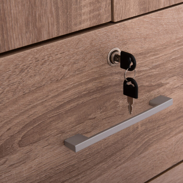 Η ντουλάπα είναι κατασκευασμένη από εξαιρετικής ποιότητας μελαμίνη. Η μελαμίνη είναι είδος ξύλου σε μορφή μοριοσανίδας, πολύ ανθεκτικό και με μεγάλη σκληρότητα. Άρα, πρόκειται για ένα συνθετικό υλικό με πολύ σκληρή επιφάνεια, με αποτέλεσμα να είναι πολύ ανθεκτική στις γρατζουνιές, στην τριβή και τους λεκέδες.
