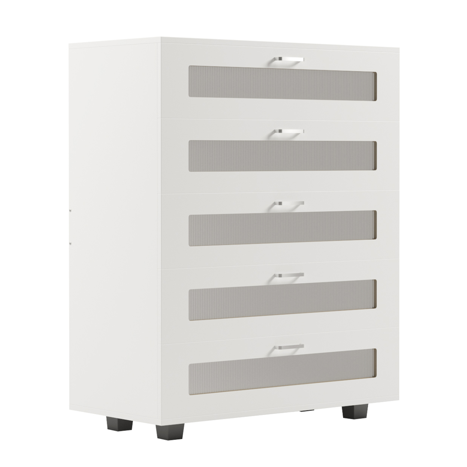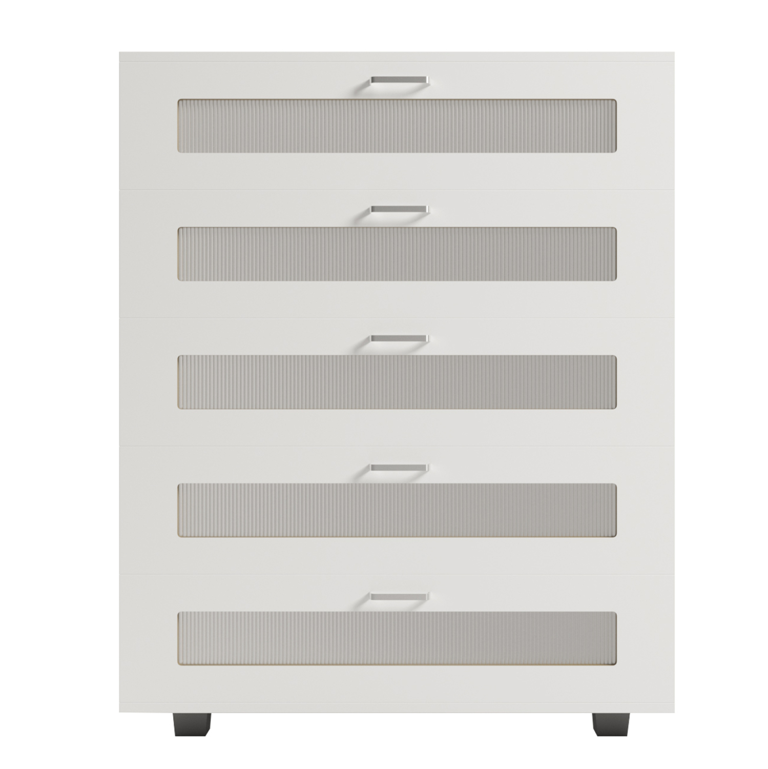 Η FB99881.03 είναι μια μεγάλη συρταριέρα με 5 φαρδιά συρτάρια που θα ικανοποιήσει όλες τις ανάγκες σας. Έχει ουδέτερο χρώμα ΛΕΥΚΟ με χερούλια σε ασημί απόχρωση. To χαρακτηριστικό που κάνει αυτή την συρταριέρα να ξεχωρίζει είναι ότι τα συρτάρια έχουν παραθυράκια από ημιδιαφανές πολυκαρβονικό γυαλί. Τα μαύρα ποδαράκια της συρταριέρας, είναι σταθερά και φαρδιά προσφέροντας στιβαρότητα στην κατασκευή και ταυτόχρονα δημιουργούν μια ευχάριστη διχρωμία με το κυρίως σώμα της συρταριέρας.