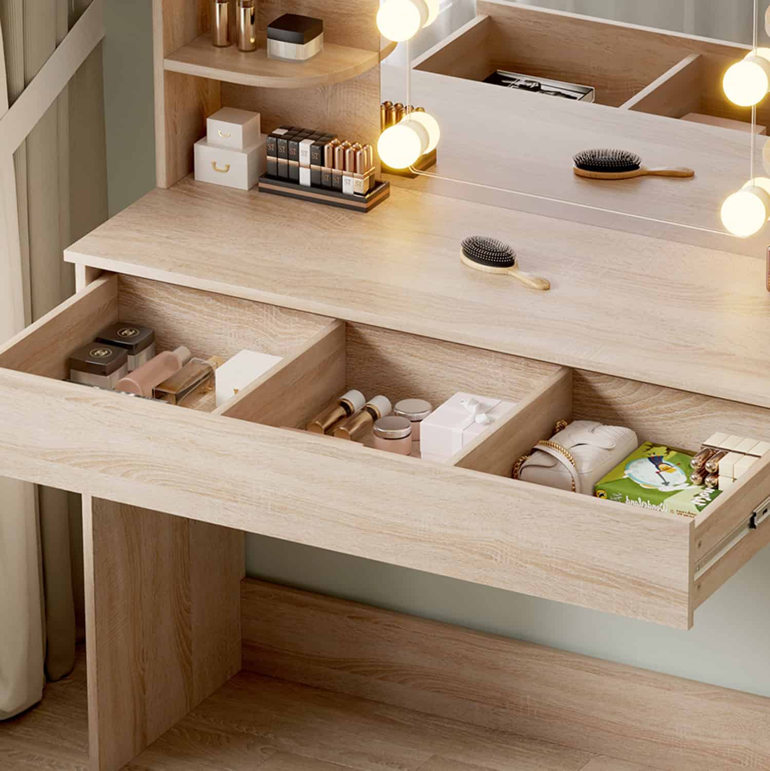Η νέα τουαλέτα FB92502.01 είναι ένα πρακτικότατο έπιπλο σε SONAMA χρώμα που θα αλλάξει την εικόνα του χώρου σας. Αποτελείται από ένα τραπέζι με καθρέπτη και 2 συρτάρια κάτω από την επιφάνεια. Αυτό όμως που κερδίζει τις εντυπώσεις είναι ότι ο καθρέπτης είναι τοποθετημένος στο κέντρο και συνοδεύεται από φώτα LED περιμετρικά, καθώς και από ράφια τοποθέτησης αντικειμένων δεξιά κι αριστερά, απογειώνοντας την χρησιμότητα του επίπλου.