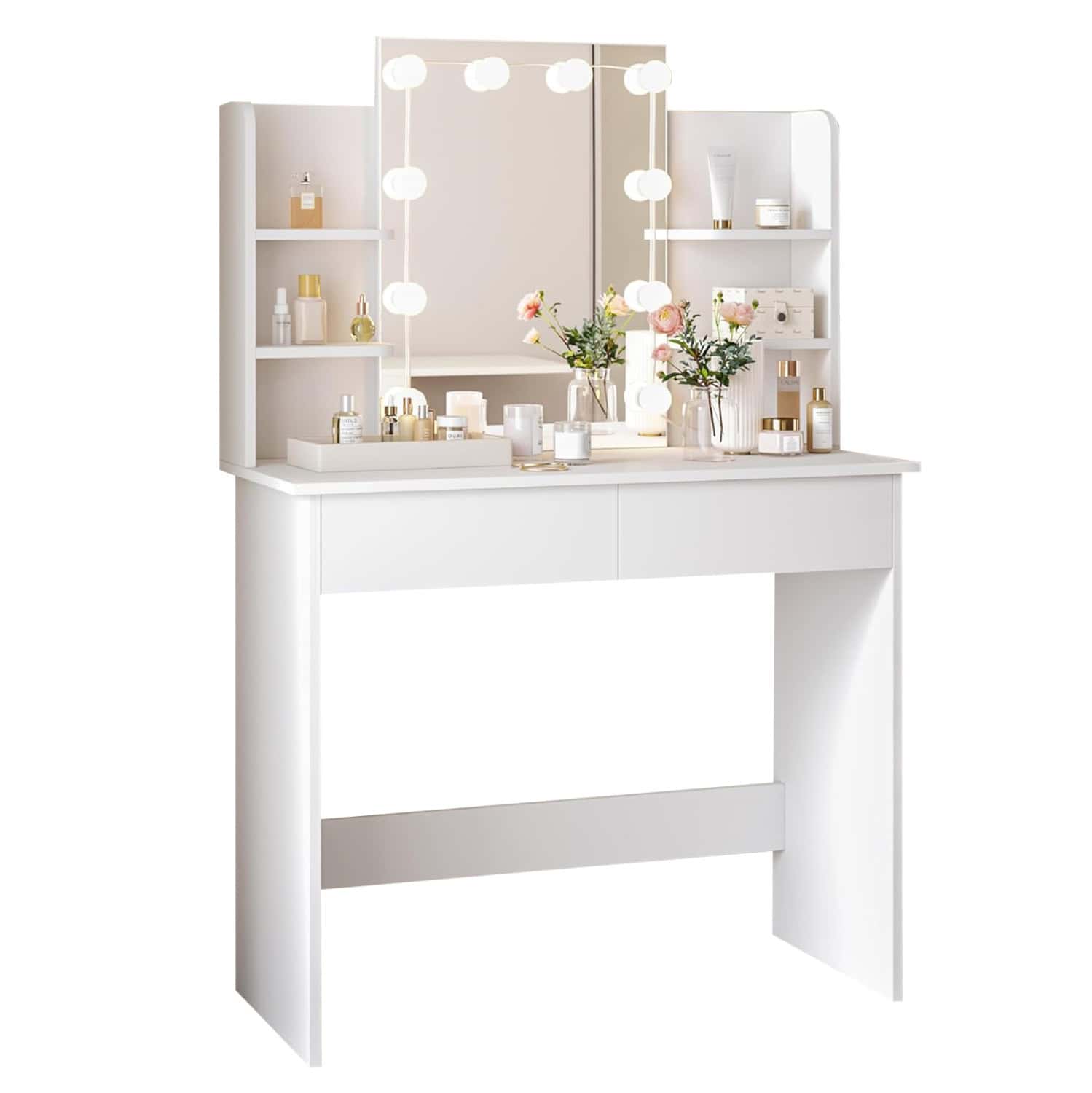 Η νέα τουαλέτα FB92502.03 είναι ένα πρακτικότατο έπιπλο σε ΛΕΥΚΟ χρώμα που θα αλλάξει την εικόνα του χώρου σας. Αποτελείται από ένα τραπέζι με καθρέπτη και 2 συρτάρια κάτω από την επιφάνεια. Αυτό όμως που κερδίζει τις εντυπώσεις είναι ότι ο καθρέπτης είναι τοποθετημένος στο κέντρο και συνοδεύεται από φώτα LED περιμετρικά, καθώς και από ράφια τοποθέτησης αντικειμένων δεξιά κι αριστερά, απογειώνοντας την χρησιμότητα του επίπλου.