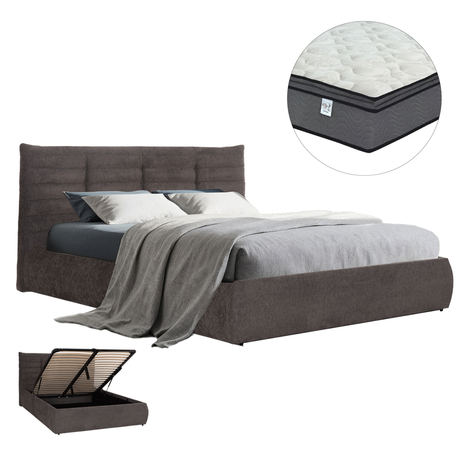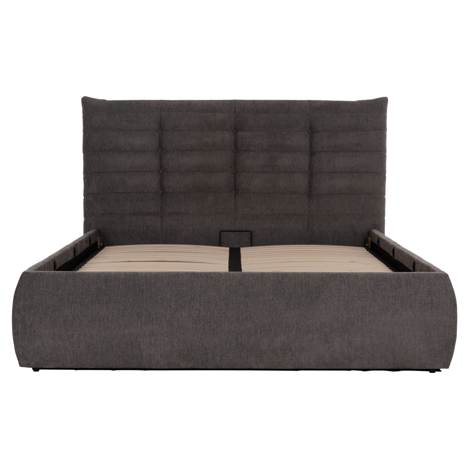 –Το εντυπωσιακό διπλό κρεβάτι FB910770 (160×200εκ) έχει επένδυση με ΓΚΡΙ ύφασμα, και μάλιστα στο κεφαλάρι σε καπιτονέ τεχνοτροπία. Το στρώμα του κρεβατιού στηρίζεται σε 20 σειρές εργονομικές τάβλες στήριξης, οι οποίες τοποθετούνται σε ένα μεταλλικό πλαίσιο που ανασηκώνεται με μηχανισμό ασφαλείας, προσφέροντας έναν μεγάλο αποθηκευτικό χώρο επενδυμένο επίσης με ύφασμα.
