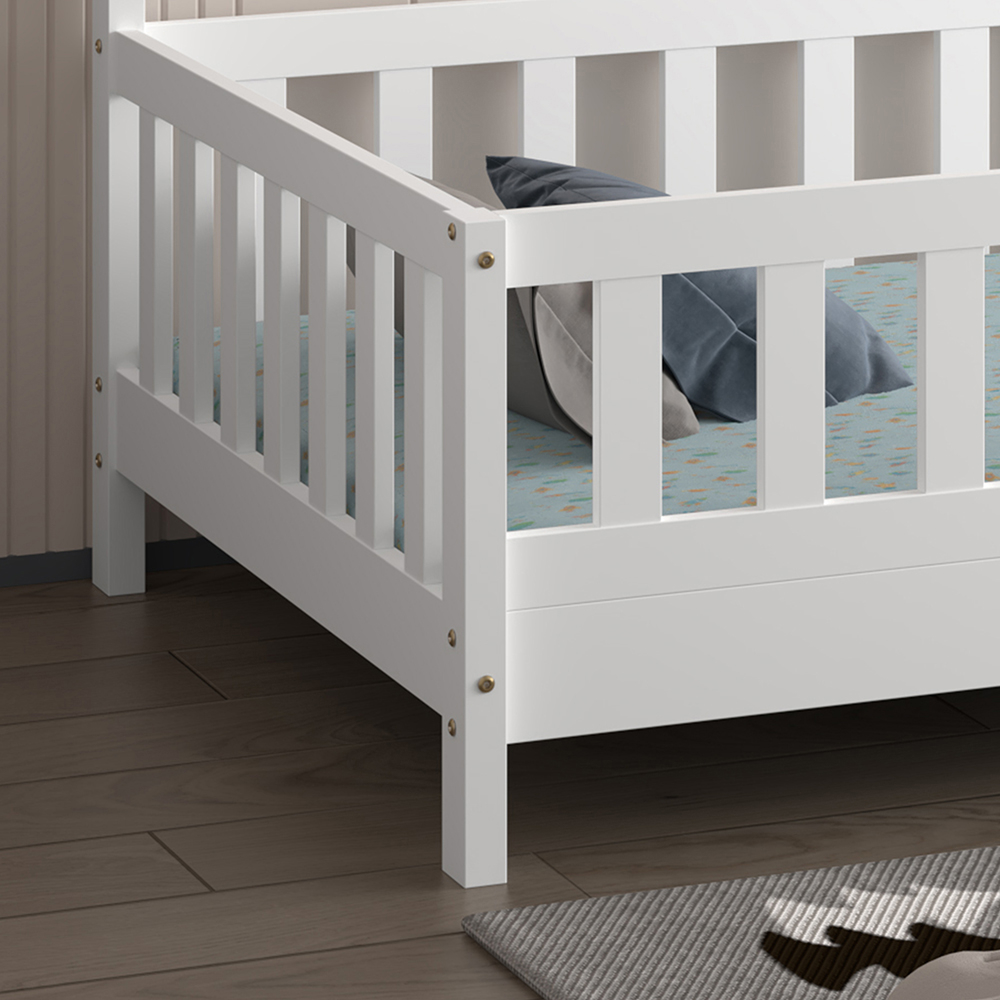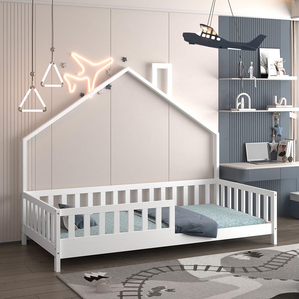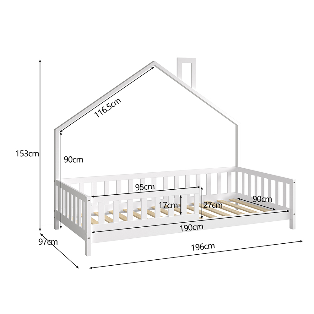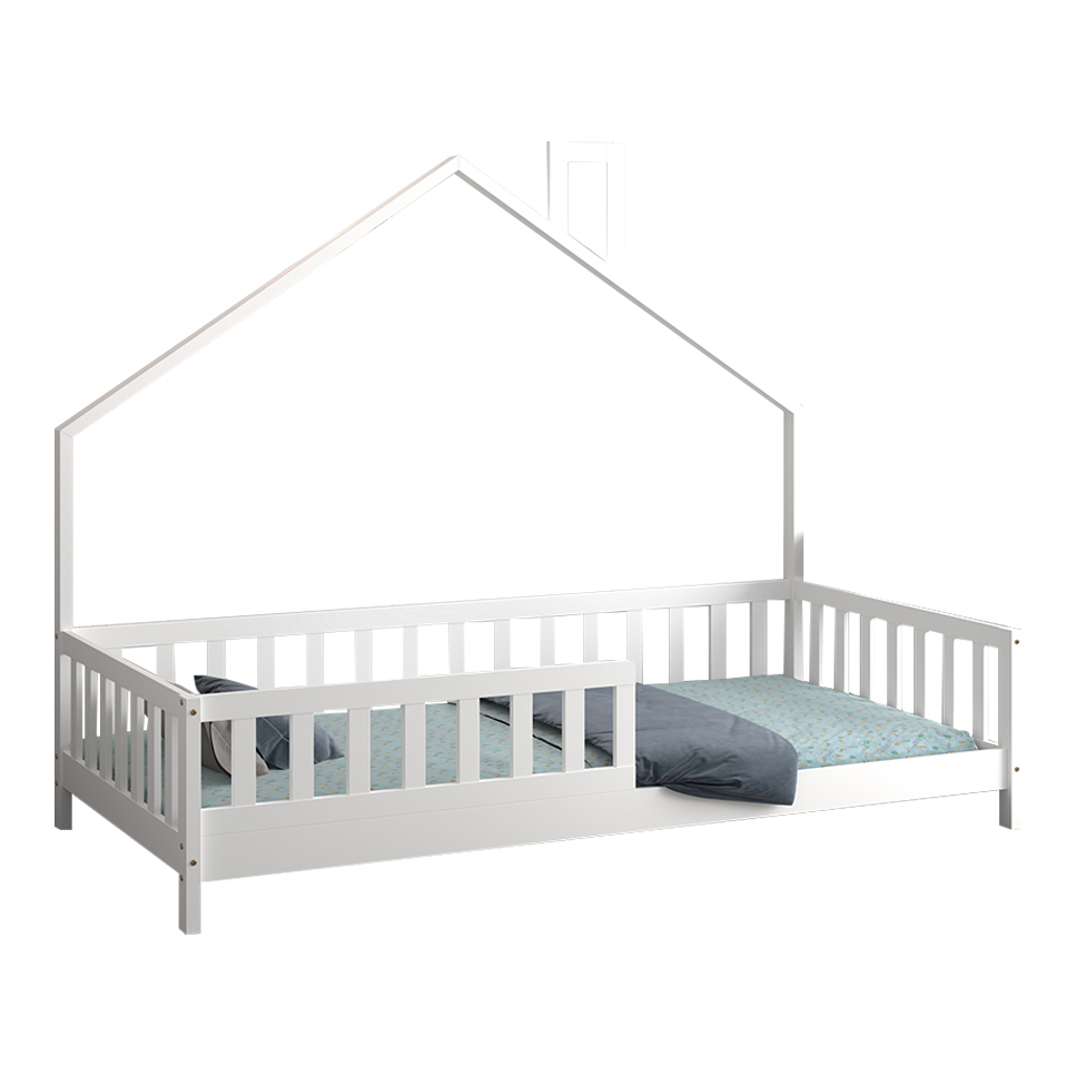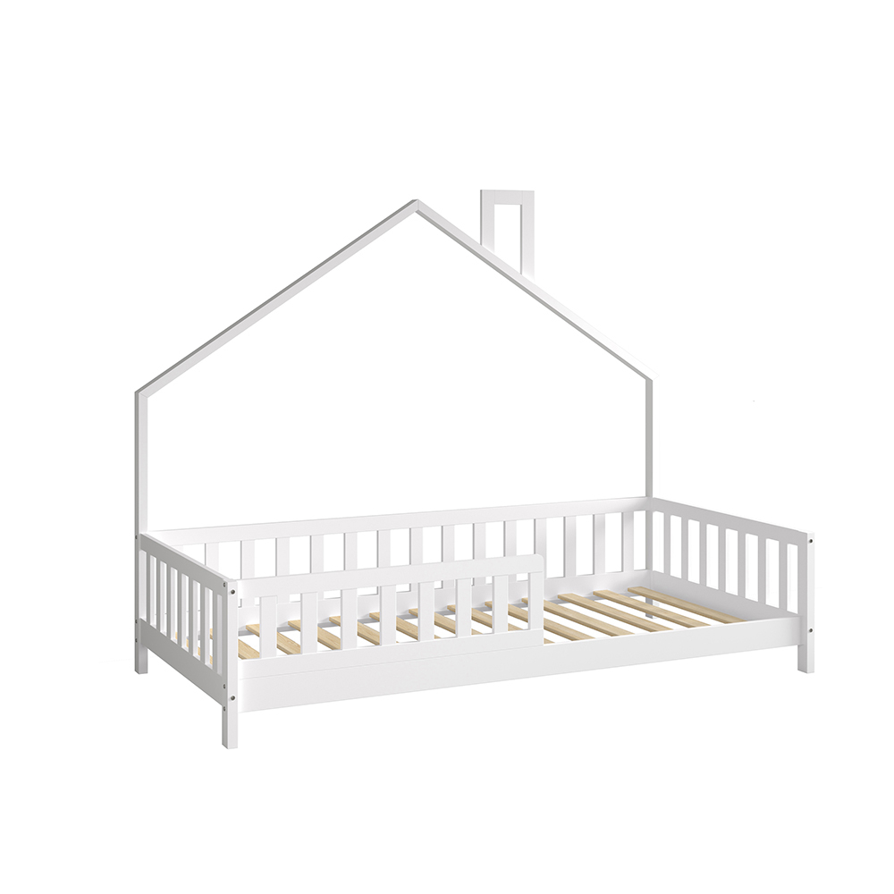 Σας παρουσιάζουμε το καινούργιο παιδικό κρεβάτι FB9740.03. Είναι σε διάσταση για μονό στρώμα 90×190 εκ, και αποτελεί μια άριστης ποιότητας, κλασική και ασφαλή επιλογή για το παιδικό δωμάτιο μιας και είναι τύπου Montessori, που σημαίνει ότι έχει σχεδιαστεί σύμφωνα με το εκπαιδευτικό σύστημα Montessori, σύμφωνα με το οποίο τα παιδιά μαθαίνουν καλύτερα, όταν επιλέγουν μόνα τους τι θα κάνουν. Το χαμηλό ύψος κρεβατιού με τα χαμηλά πόδια, βοηθά να εξερευνούν την αυτονομία τους και να ανεβοκατεβαίνουν από το κρεβάτι τους ελεύθερα ανά πάσα στιγμή. Είναι ξύλινο σε ΛΕΥΚΟ χρώμα βαμμένο με αβλαβές μη τοξικό βερνίκι με βάση το νερό, ιδανικό για παιδιά. Το στρώμα τοποθετείται σε τάβλες κατασκευασμένες από ξυλεία κόντρα πλακέ. Η μία πλευρά του κρεβατιού έχει την φιγούρα σπιτιού με καμινάδα που θα δώσει μια ευχάριστη, «ζεστή», και παιχνιδιάρικη όψη σε κάθε παιδικό δωμάτιο, ενώ διαθέτει κάγκελα περιμετρικά.