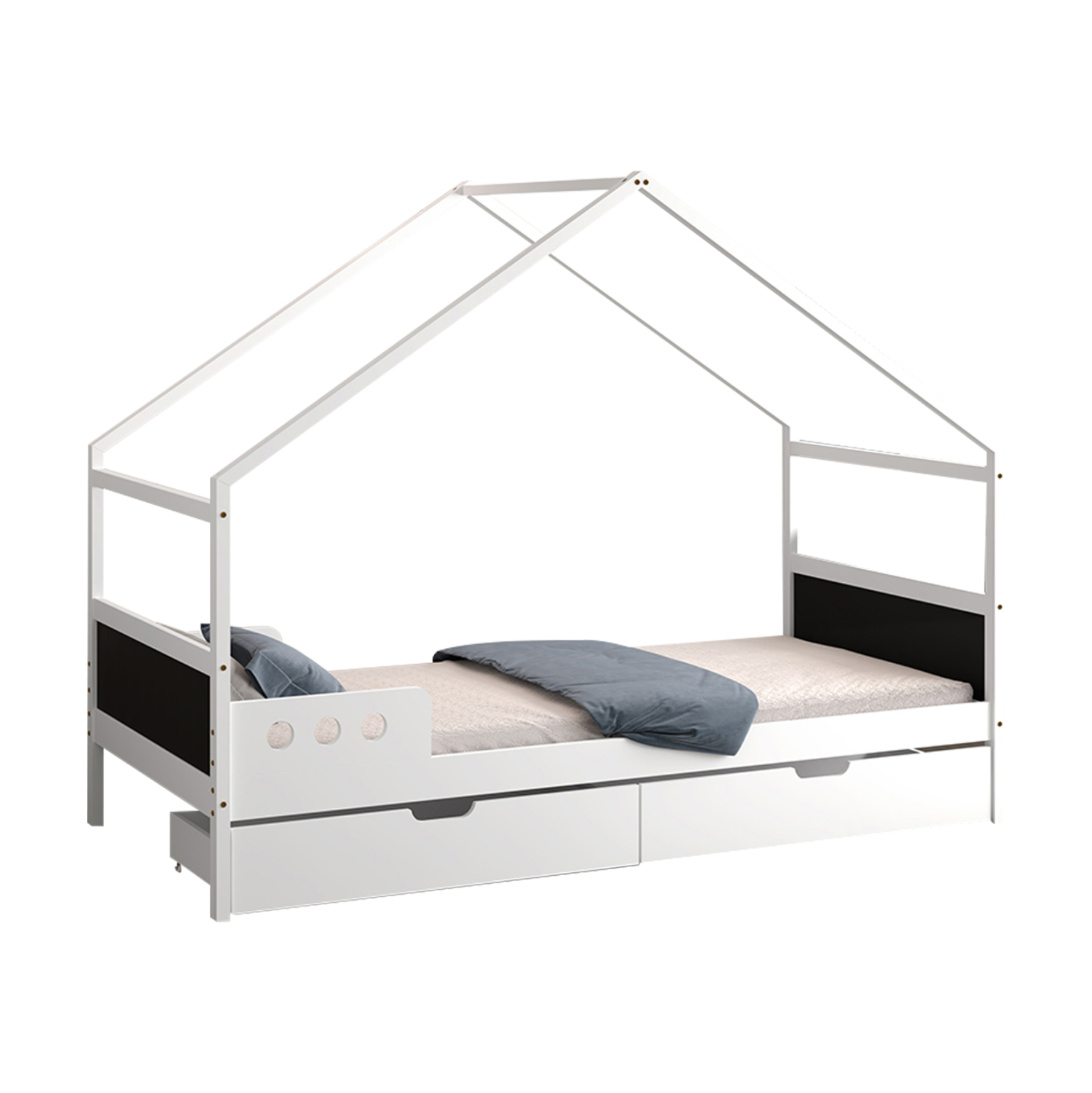 Το στρώμα τοποθετείται σε τάβλες κατασκευασμένες από ξυλεία κόντρα πλακέ. Ολόκληρο το κρεβάτι έχει σχήμα σπιτιού και μάλιστα αρκετά ψηλό, που θα δώσει μια ευχάριστη, «ζεστή», και παιχνιδιάρικη όψη σε κάθε παιδικό δωμάτιο.