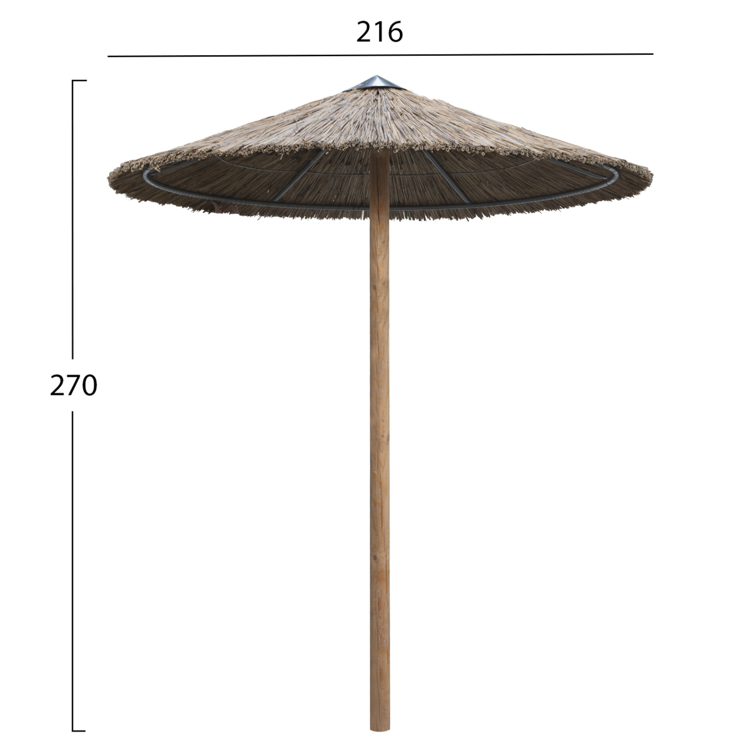 •Η ομπρέλα είναι ψάθινη ενώ ο στύλος της ομπρέλας αλλά και το τραπεζάκι είναι από «άγριο» ξύλο πεύκου, εμποτισμένο και τορναρισμένο.