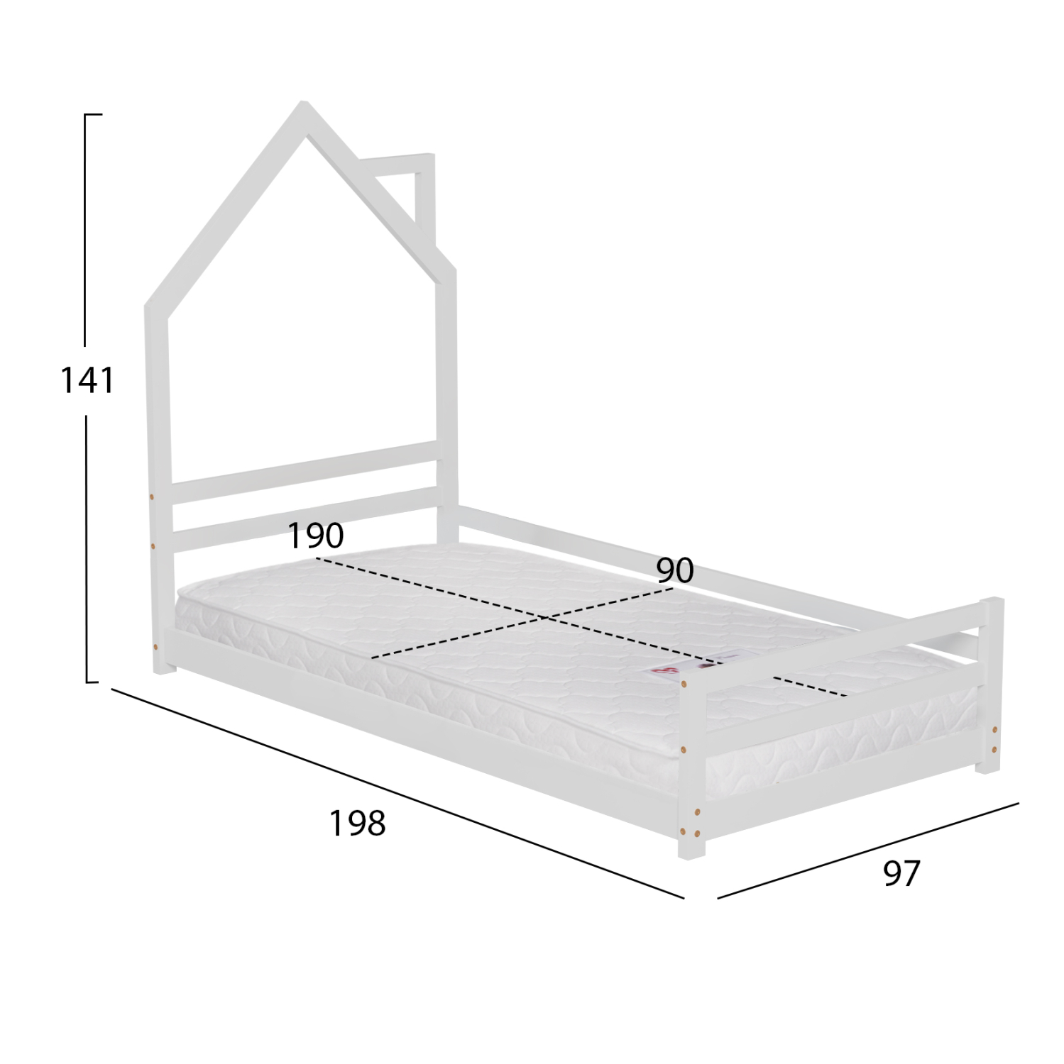 Το παιδικό κρεβάτι FB921301 τύπου Montessori σε διάσταση για στρώμα 90×190εκ, είναι κατασκευασμένο από ξύλο πεύκου σε ΛΕΥΚΟ χρώμα. Tο κεφαλάρι έχει σχήμα σπιτιού με καμινάδα και τα πόδια είναι εξαιρετικά χαμηλά, ενώ το στρώμα τοποθετείται σε τάβλες από κόντρα-πλακέ ξυλεία.