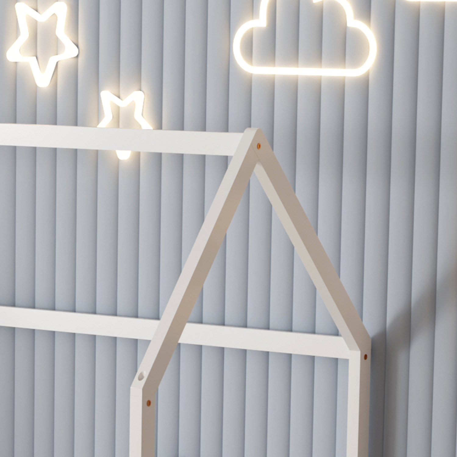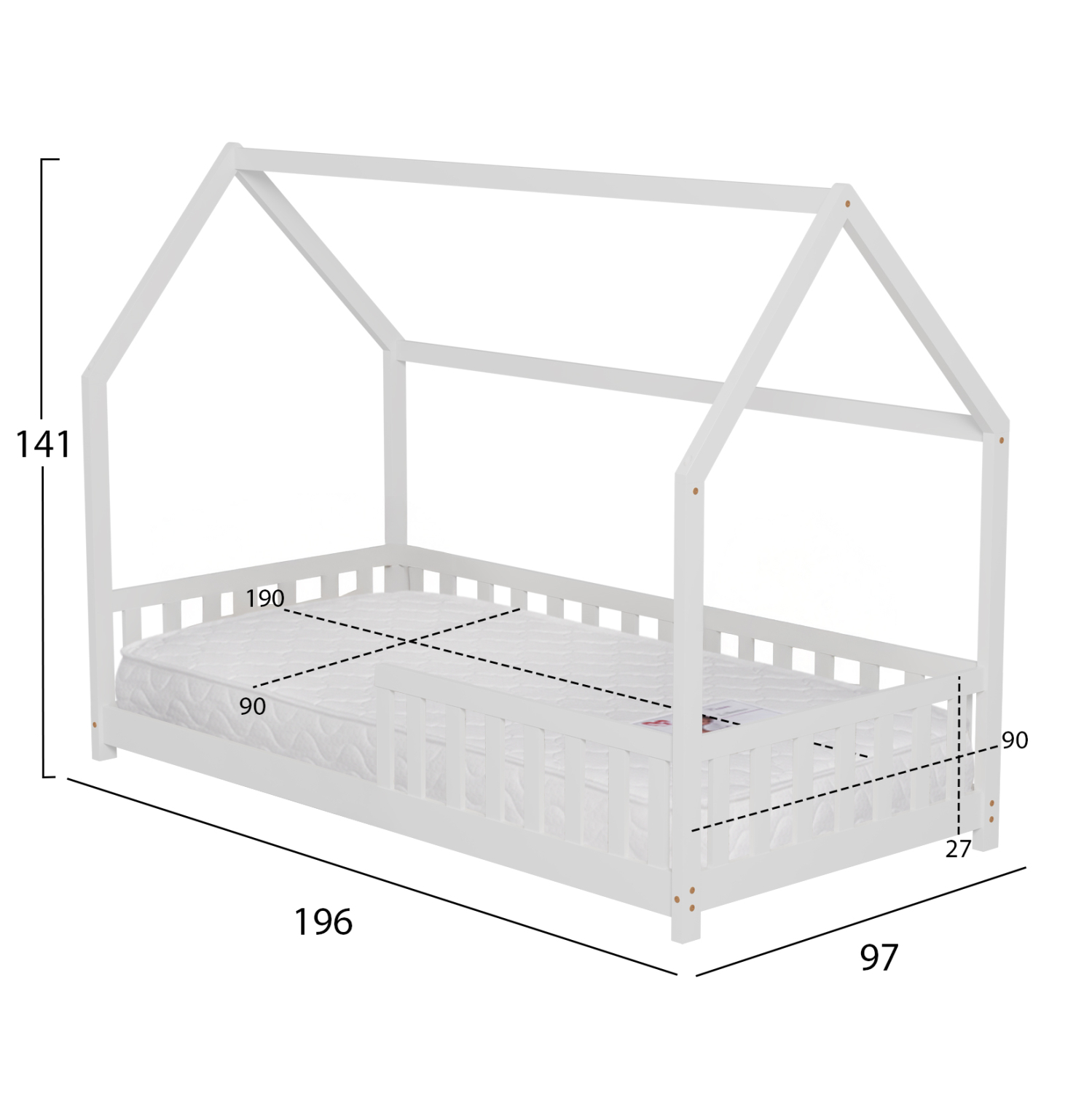 Το παιδικό κρεβάτι FB921304.01 τύπου Montessori σε διάσταση για στρώμα 90×190εκ, είναι κατασκευασμένο από ξύλο πεύκου σε ΛΕΥΚΟ χρώμα. Όλο το κρεβάτι έχει σχήμα σπιτιού με εξαιρετικά χαμηλά πόδια και περιμετρικά κάγκελα, ενώ το στρώμα τοποθετείται σε τάβλες από κόντρα-πλακέ ξυλεία.