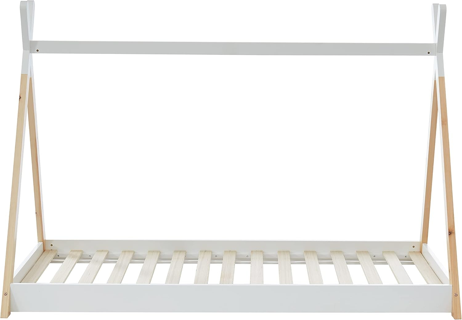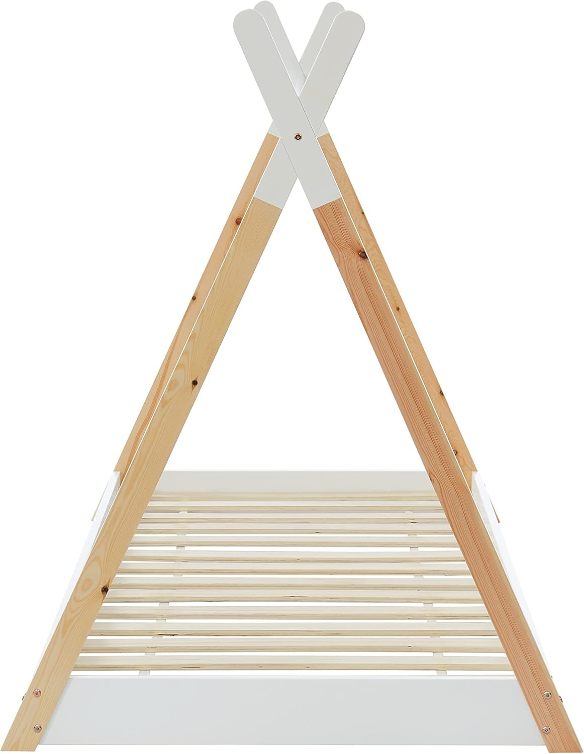 Το παιδικό κρεβάτι FB921308 τύπου Montessori σε διάσταση για στρώμα 90×190εκ, είναι κατασκευασμένο από ξύλο πεύκου σε διχρωμία ΦΥΣΙΚΟΥ/ΛΕΥΚΟΥ. Το κρεβάτι έχει σχήμα σκηνής και τα πόδια είναι εξαιρετικά χαμηλά, ενώ το στρώμα τοποθετείται σε τάβλες από κόντρα-πλακέ ξυλεία.