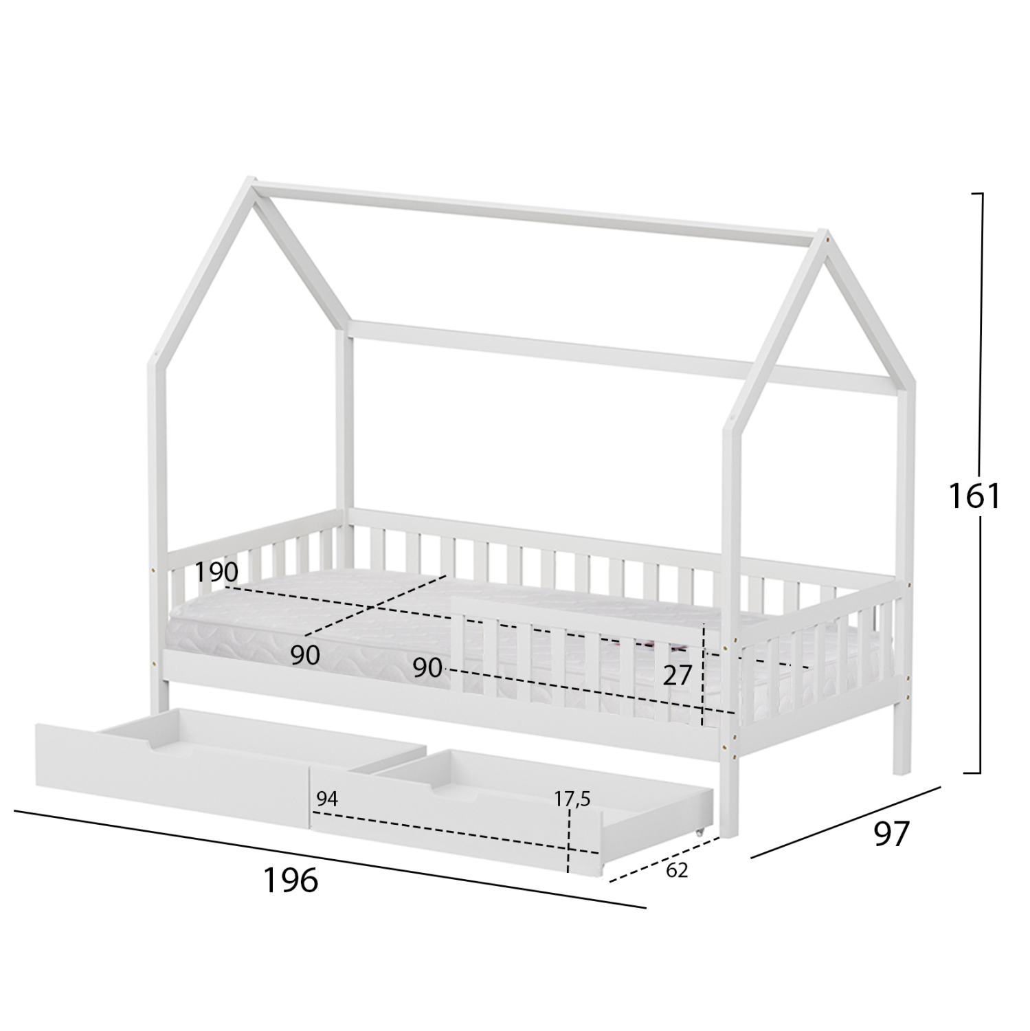 Το παιδικό κρεβάτι FB921324.01 τύπου Montessori σε διάσταση για στρώμα 90×190εκ, είναι κατασκευασμένο από ξύλο πεύκου σε ΛΕΥΚΟ χρώμα. Όλο το κρεβάτι έχει σχήμα σπιτιού με περιμετρικά κάγκελα και διαθέτει 2 συρτάρια στο κάτω μέρος ως αποθηκευτικό χώρο, ενώ το στρώμα τοποθετείται σε τάβλες από κόντρα-πλακέ ξυλεία.