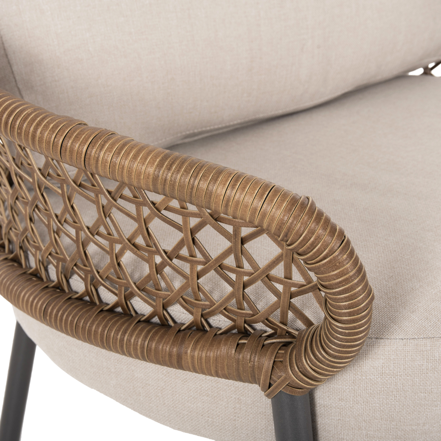 Σας παρουσιάζουμε το όμορφο σετ σαλονιού εξωτερικού χώρου FB96079 σε συνδυασμό χρωμάτων που θα λατρέψετε, με 2 τραπεζάκια, 2 πολυθρόνες και 1 διθέσιο καναπέ. Ο σκελετός σε όλο το σετ είναι από αλουμίνιο επενδυμένο με συνθετικό RATTAN σε ΧΑΚΙ χρώμα. Το design τους είναι πανέμορφο στην όψη ενώ η στιβαρότητά τους είναι εμφανής. Τα δύο τραπεζάκια με την οβάλ ΓΚΡΙ επιφάνεια είναι πρακτικότατα, ενώ οι πολυθρόνες είναι φαρδιές με πλάτη ημικυκλική και αγκαλιάζουν το σώμα πράγμα που επιτείνει την άνεση που προσφέρουν, σε συνδυασμό με τα αναπαυτικά μαξιλάρια τόσο στο κάθισμα όσο και στην πλάτη. Ο διθέσιος καναπές σε παρόμοιο design είναι, όμως, το πιο εντυπωσιακό κομμάτι αυτού του σετ που τον καθιστούν το σημείο αναφοράς. Τα μαξιλάρια σε όλο το σετ είναι επενδυμένα με πολυεστερικό ύφασμα σε ΜΠΕΖ χρώμα και διαθέτουν γέμισμα με μέτριας σκληρότητας αφρώδη υλικά για την μεγαλύτερη δυνατή άνεση, αλλά και φερμουάρ. Τι άλλο να ζητήσει κανείς για να αναβαθμίσει τον εξωτερικό χώρο της επιχείρησής του;