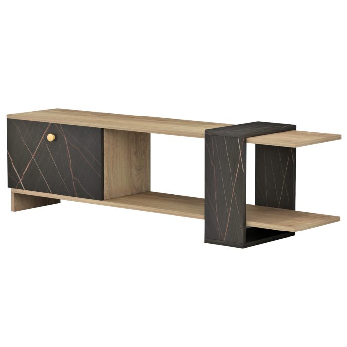 Το FB98900.12 είναι ένα μοντέρνο και λειτουργικό έπιπλο τηλεόρασης, που θα ομορφύνει το σαλόνι σας! Απευθύνεται σε όσους δεν έχουν μεγάλο χώρο μιας και δεν έχει ιδιαίτερα μεγάλες διαστάσεις αλλά σίγουρα το design του θα τραβήξει τα βλέμματα. Κάτω από την κύρια επιφάνεια του επίπλου υπάρχει ένα ντουλάπι που ανοίγει προς τα κάτω, και όλο το υπόλοιπο είναι ανοιχτός χώρος αποθήκευσης. Πρόκειται για μια κομψή και λιτή πρόταση για το σαλόνι σας σε χρώμα SONAMA με ΜΑΥΡΟ ΜΑΡΜΑΡΟ!