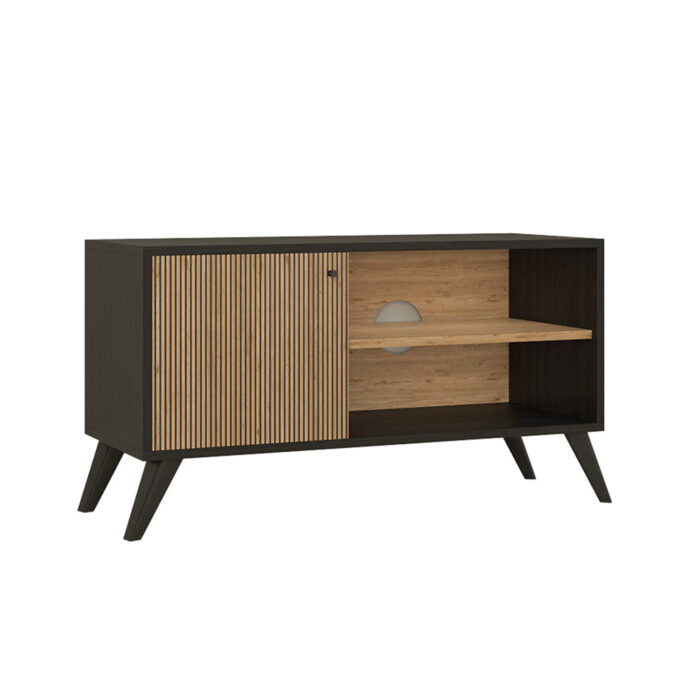 Το FB99443.11 είναι ένα μοντέρνο και λειτουργικό έπιπλο τηλεόρασης, που θα ομορφύνει το σαλόνι σας! Είναι σχετικά μικρό και διαθέτει 1 ντουλάπι κι έναν ανοιχτό χώρο τοποθέτησης αντικειμένων με ράφι. Τα χρώματα του επίπλου είναι το μαύρο που είναι και το χρώμα της επιφάνειας, και το φυσικό του ξύλου που είναι το χρώμα στο ντουλάπι και στο ράφι. Πρόκειται για μια κομψή και βολική πρόταση για σαλόνια χωρίς ιδιαίτερα μεγάλο χώρο!