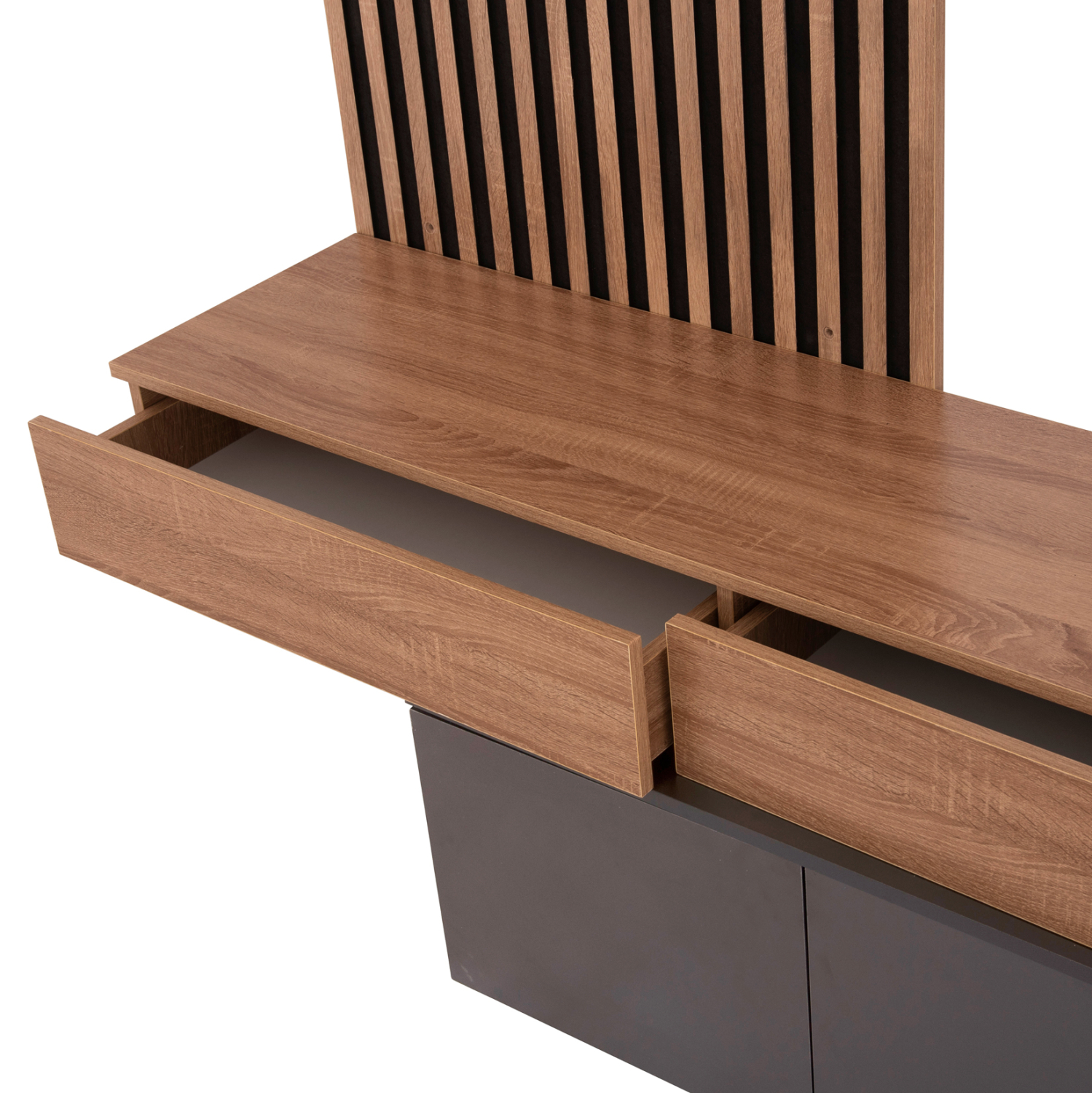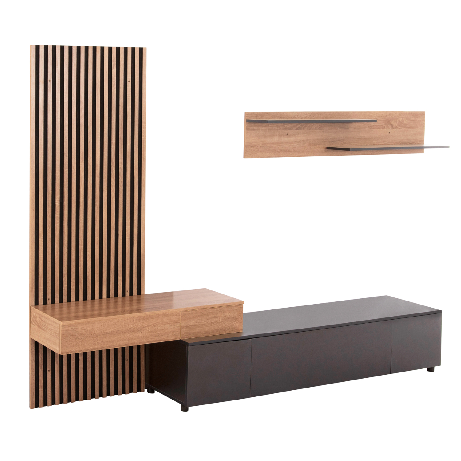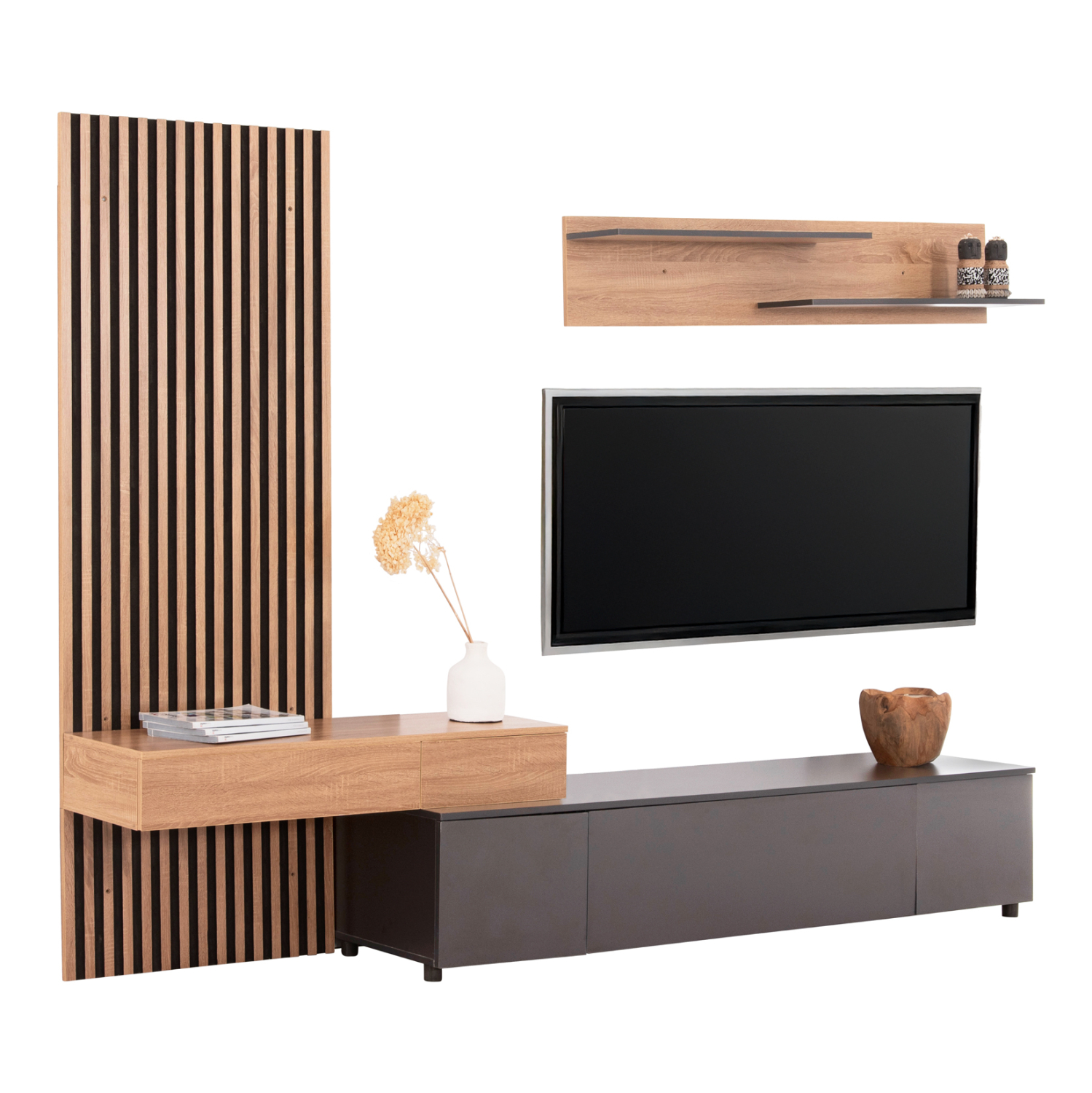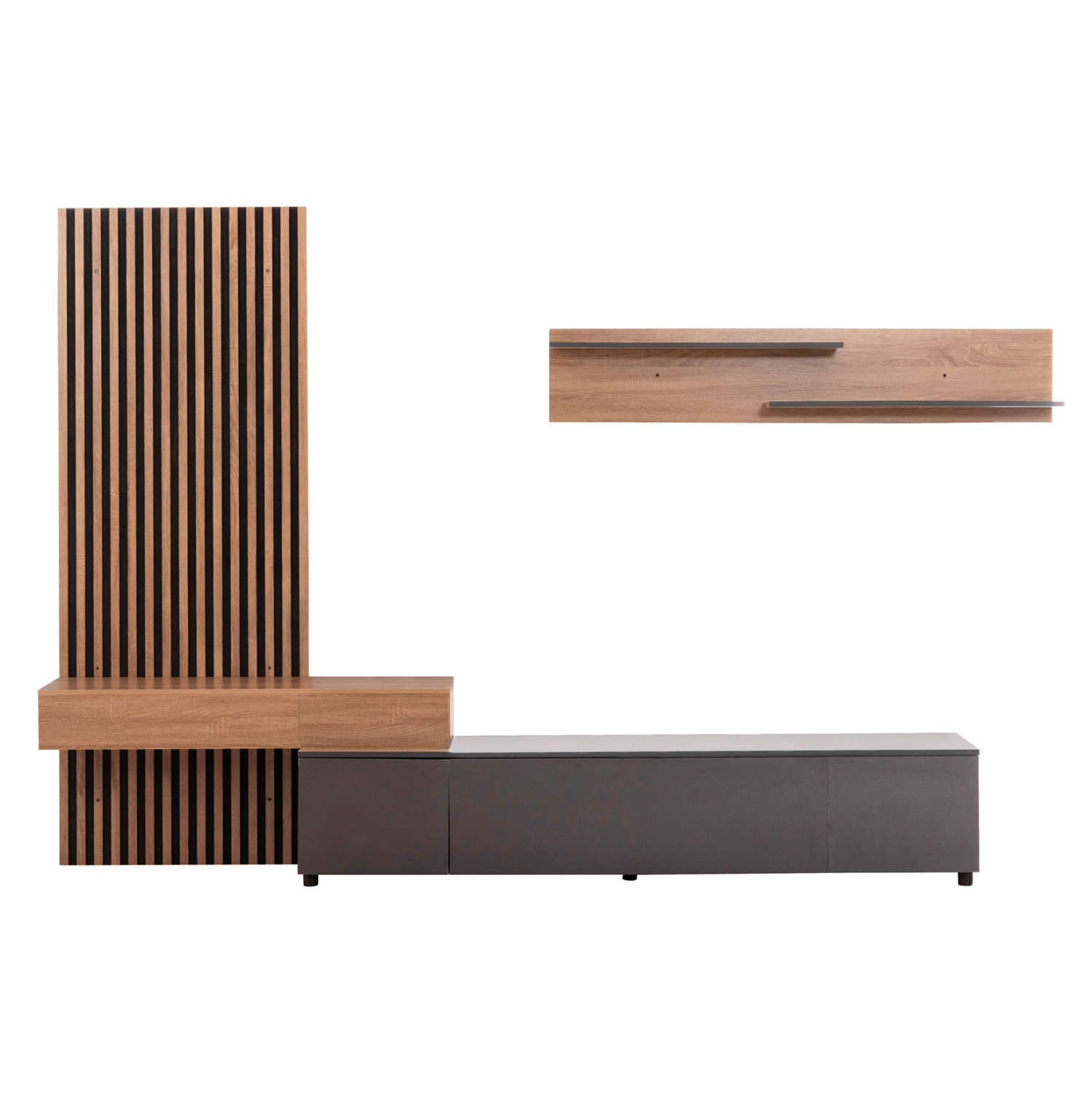 Η σύνθεση επίπλου για την τηλεόραση FB918076.02 είναι μια μοντέρνα πρόταση σε ΣΚΟΥΡΟ ΓΚΡΙ και ΣΟΝΑΜΑ χρώμα, που θα ομορφύνει το σαλόνι σας! Αποτελείται από μια διακοσμητική «πλάτη», έναν επιτοίχιο συνδυασμό με 2 ραφάκια στο επάνω μέρος και το κυρίως έπιπλο δαπέδου. Το design είναι σε μοντέρνα γραμμή και είναι σίγουρο ότι οι αποθηκευτικοί χώροι θα εντυπωσιάσουν και τους πιο δύσκολους, τόσο στην όψη όσο και με την πρακτικότητά τους.