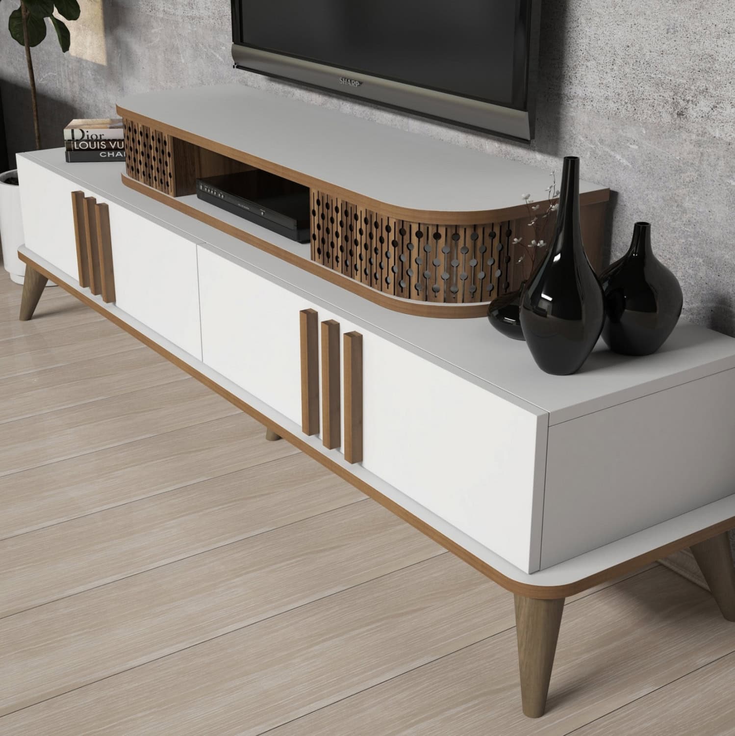 Το FB99515.03 είναι μια μοντέρνα και λειτουργική σύνθεση τηλεόρασης σε ΛΕΥΚΟ και ΚΑΡΥΔΙ χρώμα, που θα ομορφύνει το σαλόνι σας! Αποτελείται από το κυρίως έπιπλο δαπέδου το οποίο διαθέτει 2 ντουλάπια, καθώς και 1 μακρύ ράφι τοίχου. Η ιδιαιτερότητα αυτής της σύνθεσης είναι ένα επιπλέον μικρότερο ράφι επάνω στο κυρίως έπιπλο με ανοιχτό χώρο τοποθέτησης συσκευών και με όμορφο σκαλιστό σχέδιο. Πρόκειται για μια κομψή πρόταση για το σαλόνι σας.