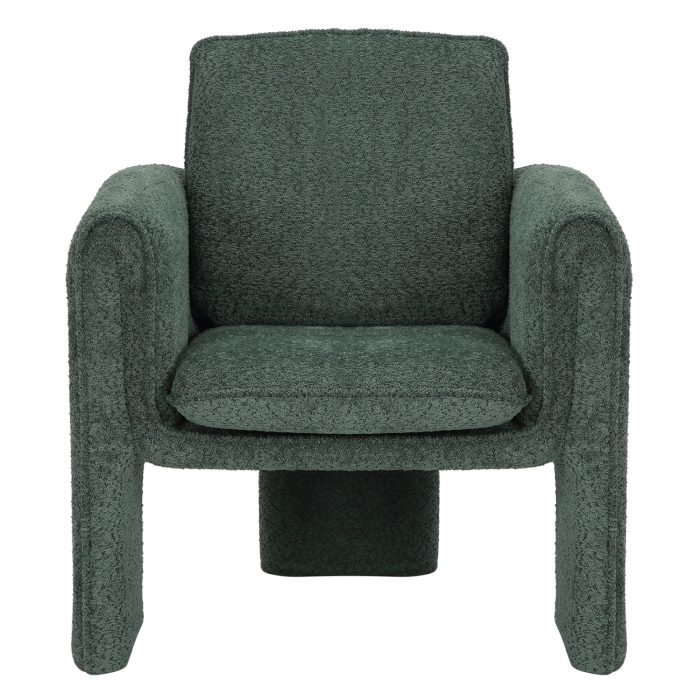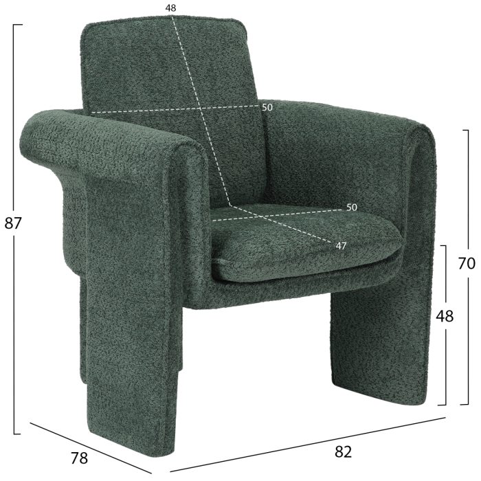 Ο σκελετός της πολυθρόνας είναι μεταλλικός με ηλεκτροστατική βαφή, ενώ ολόκληρη η επένδυση έχει γίνει με μπουκλέ ύφασμα εξαιρετικής ποιότητας και υφής. Μπουκλέ λέγεται οποιοδήποτε ύφασμα που έχει κόμπο-μπούκλα στην ύφανσή του. Κατασκευάζεται από σχεδόν όλες τις πρώτες ύλες (αν και συνήθως είναι συνθετικό) με ειδικές κλωστές με κόμπους ή πολύ στριμμένα νήματα, έτσι ώστε να έχει σγουρή επιφάνεια. Δεν τσαλακώνει και μπορεί να είναι μονόχρωμο, μελανζέ ,καρώ ή τουιντ.