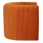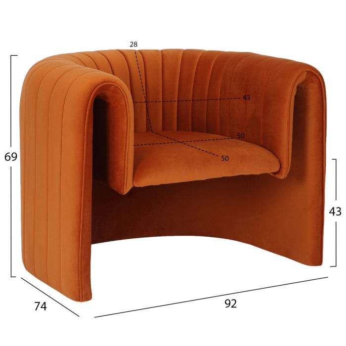 Η πολυθρόνα εσωτερικού χώρου FB99682.05 σε ΠΟΡΤΟΚΑΛΙ χρώμα είναι μοντέρνα και πανέμορφη. Το χαρακτηριστικό που κάνει αυτή την πολυθρόνα να ξεχωρίζει είναι οι καμπύλες του μεταλλικού σκελετού που σχηματίζουν την ημικυκλική πλάτη με τα μπράτσα και όλη η κατασκευή φτάνει μέχρι κάτω δημιουργώντας ουσιαστικά και τα πόδια της πολυθρόνας ως φυσική συνέχεια του design. Μια πολυθρόνα με βελούδινη επένδυση που είναι σίγουρο ότι θα μαγνητίσει το ενδιαφέρον όλων.