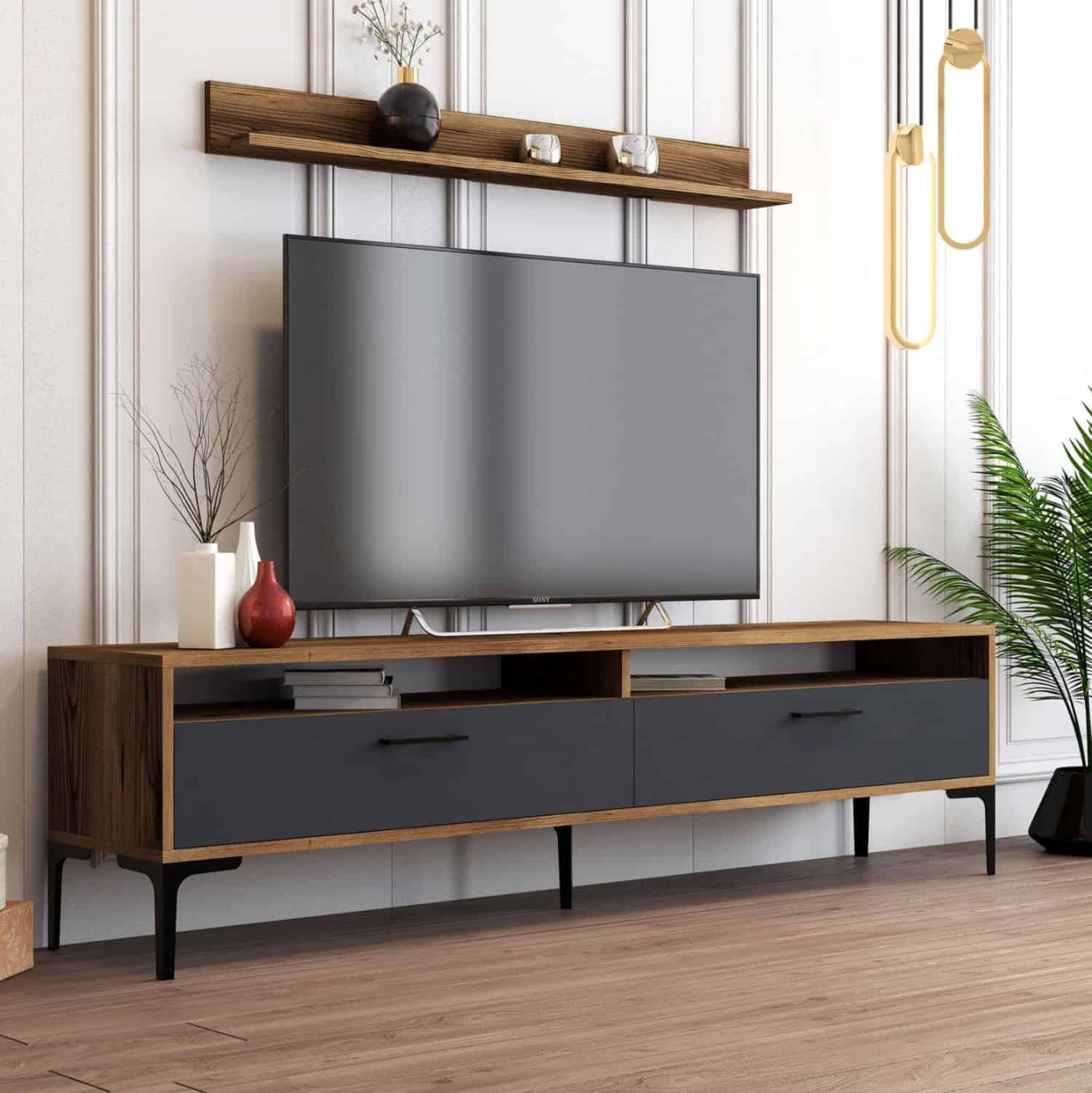 Η σύνθεση FB911856.02 θα αλλάξει την όψη στο σαλόνι σας και θα σας προσφέρει την αναβάθμιση που θέλετε. Αποτελείται από έναν συνδυασμό επίπλων για την τηλεόρασή σας με μονάδα δαπέδου και επιτοίχιo ράφι και ένα τραπεζάκι σαλονιού. Όλη η σύνθεση είναι της ίδιας σειράς και τα κυρίαρχα χρώματα είναι το ΚΑΡΥΔΙ και το ΑΝΘΡΑΚΙ.
