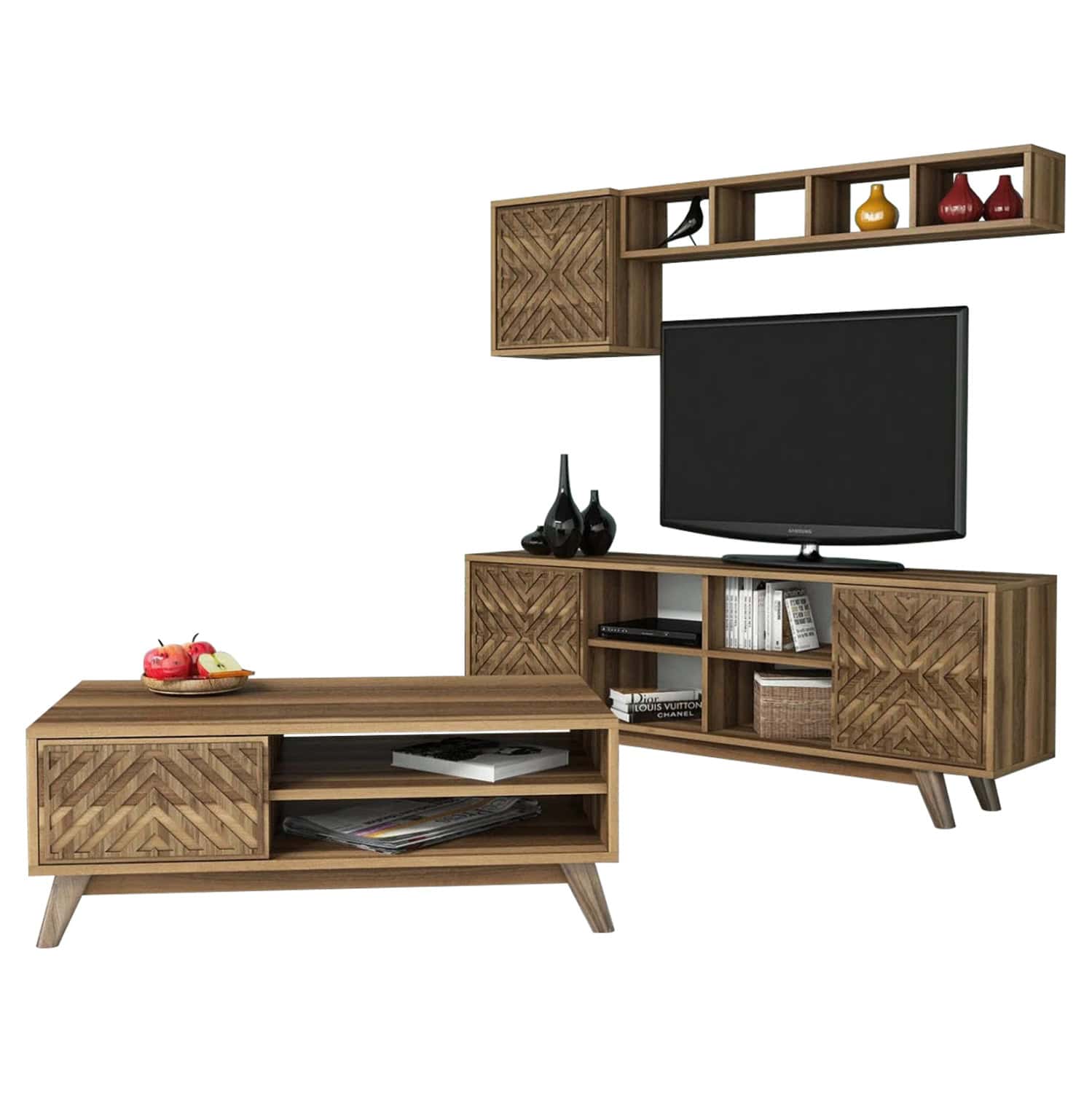 Η σύνθεση FB911853.01 θα αλλάξει την όψη στο σαλόνι σας και θα σας προσφέρει την αναβάθμιση που θέλετε. Αποτελείται από έναν συνδυασμό επίπλων για την τηλεόρασή σας με μονάδα δαπέδου, επιτοίχιο ράφι και επιτοίχιο ντουλάπι, και ένα τραπεζάκι σαλονιού. Χαρακτηριστικό όλης της σύνθεσης είναι οι πολλοί χώροι αποθήκευσης και τοποθέτησης αντικειμένων. Όλη η σύνθεση είναι της ίδιας σειράς και το κυρίαρχο χρώμα είναι το ΚΑΡΥΔΙ.