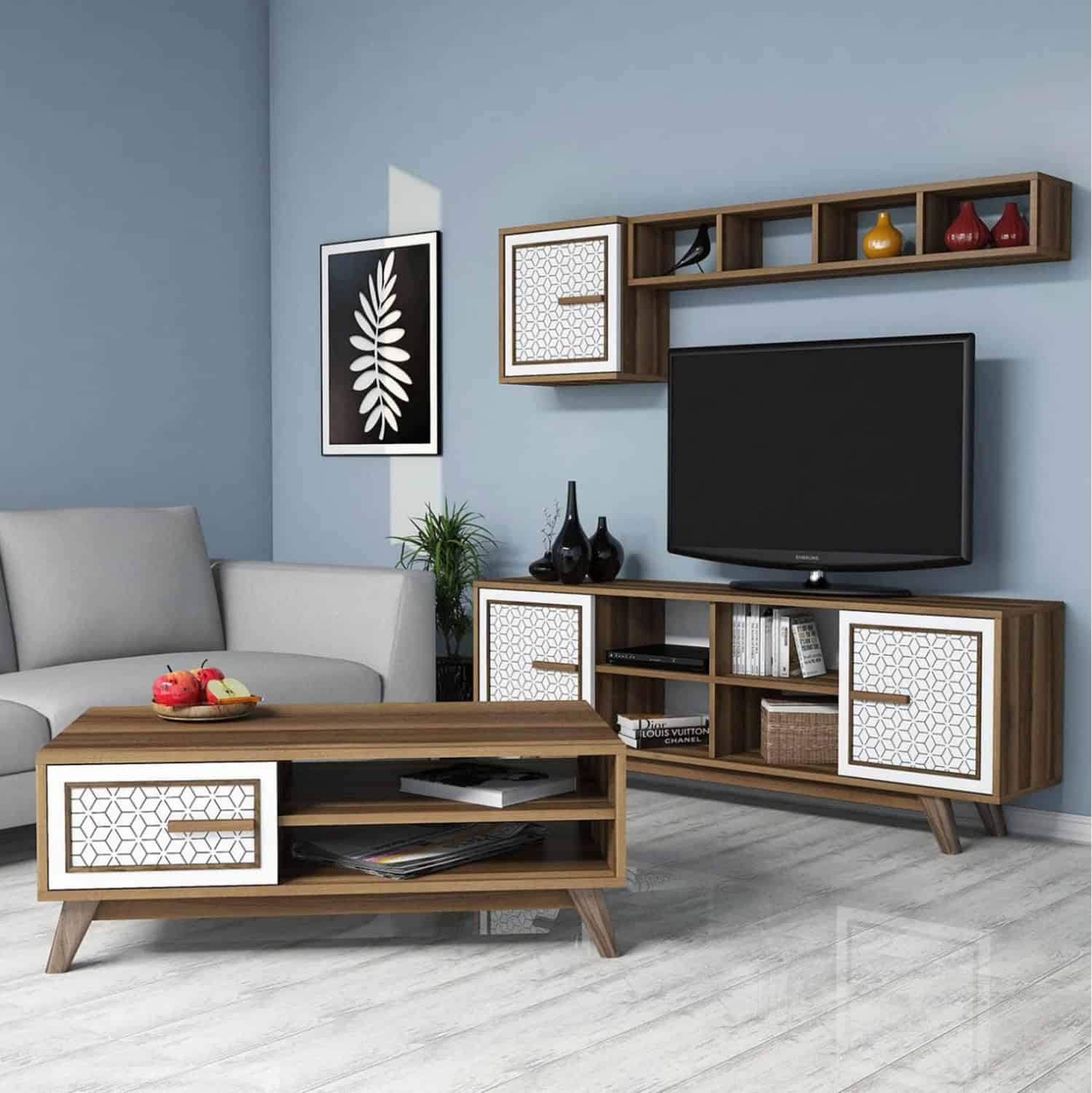 Η σύνθεση FB911852.03 θα αλλάξει την όψη στο σαλόνι σας και θα σας προσφέρει την αναβάθμιση που θέλετε. Αποτελείται από έναν συνδυασμό επίπλων για την τηλεόρασή σας με μονάδα δαπέδου, επιτοίχιο ράφι και επιτοίχιο ντουλάπι, και ένα τραπεζάκι σαλονιού. Όλη η σύνθεση είναι της ίδιας σειράς και τα κυρίαρχα χρώματα είναι το ΚΑΡΥΔΙ και το ΛΕΥΚΟ.