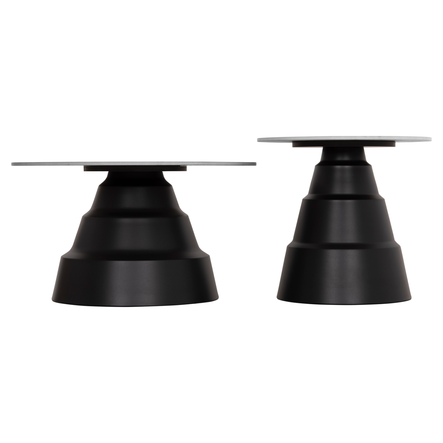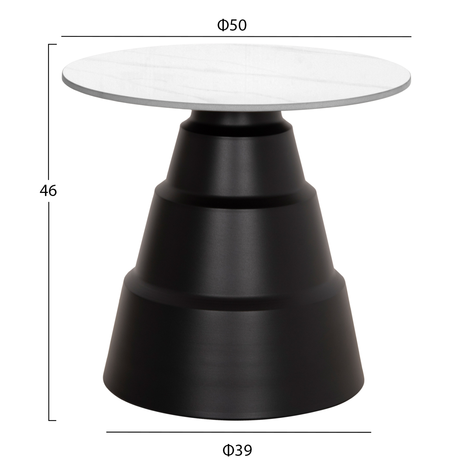 Αυτό το σετ τραπεζιών για το σαλόνι αποτελείται από 2 μεταλλικά τραπεζάκια στρογγυλά διαφορετικών μεγεθών. Οι βάσεις τους έχουν σχήμα διαβαθμισμένου κώνου σε ΜΑΥΡΟ χρώμα, ενώ οι επιφάνειες είναι κατασκευασμένες από γυαλιστερό sintered stone σε χρωματικό σχήμα SNOW WHITE. Ιδανικά τόσο για το σπίτι, όσο και για επαγγελματικούς χώρους.