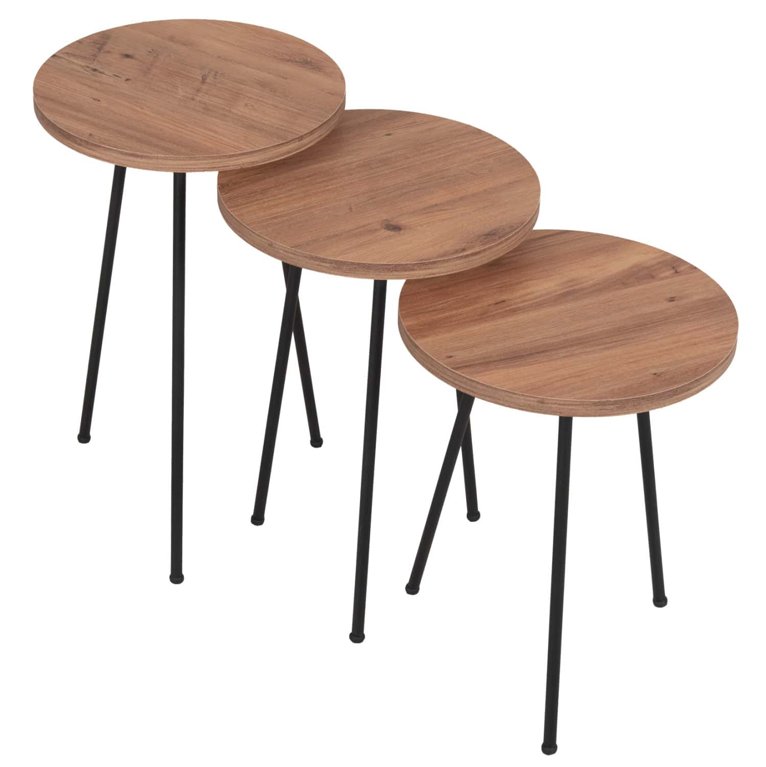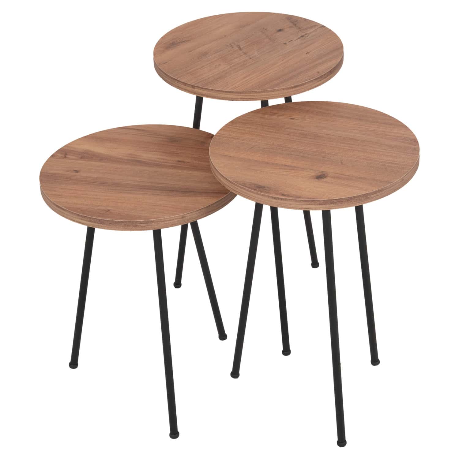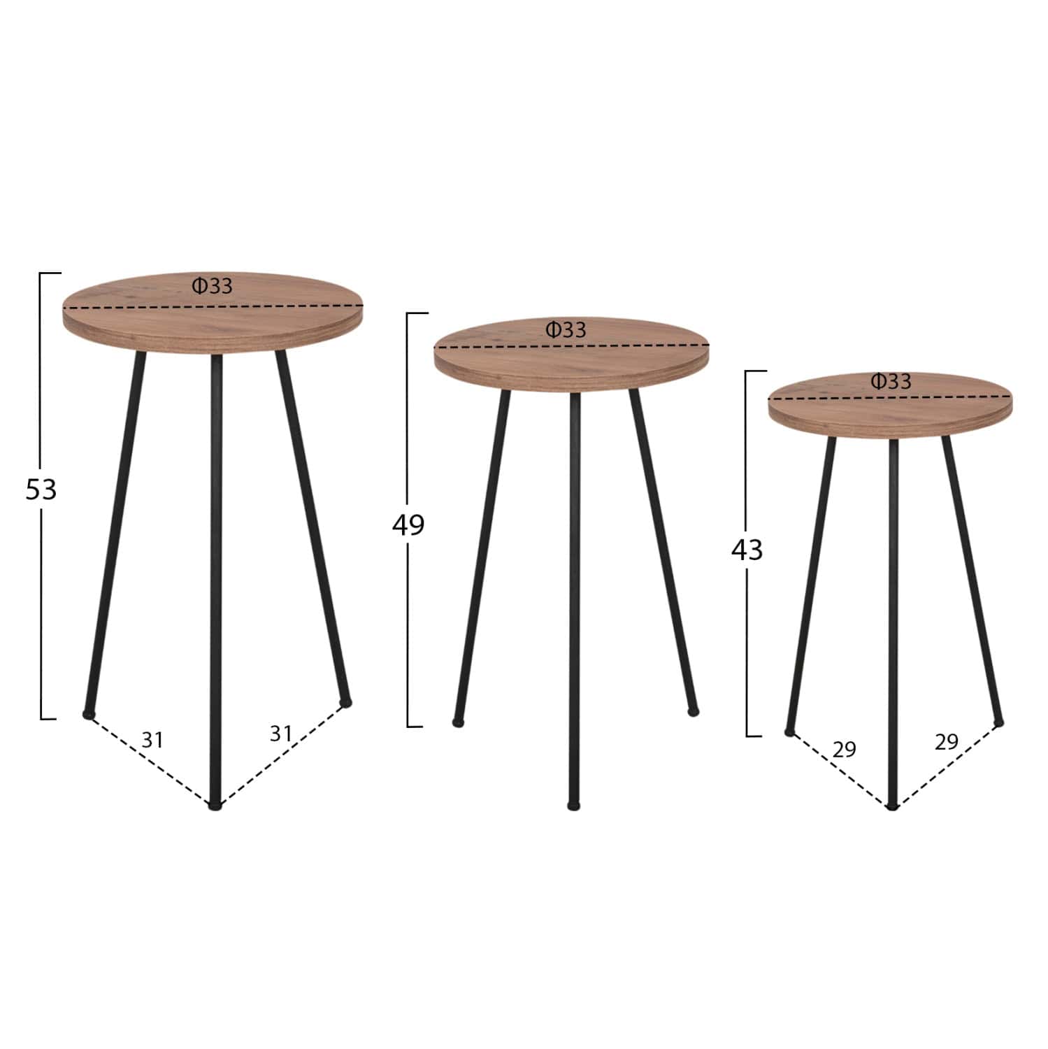 Τα 3 βοηθητικά στρογγυλά τραπεζάκια FB918174.04 ήρθαν για να κλέψουν την παράσταση με το στυλ και την πρακτικότητά τους. Η επιφάνειά τους είναι από μελαμίνη 18mm σε ΦΥΣΙΚΟ χρώμα ξύλου, ενώ τα πόδια τους είναι συμπαγή μεταλλικά σε ΜΑΥΡΟ χρώμα. Το χαρακτηριστικό τους είναι ότι έρχονται σε 3 διαφορετικά ύψη εξυπηρετώντας κάθε ανάγκη στον χώρο του σαλονιού.