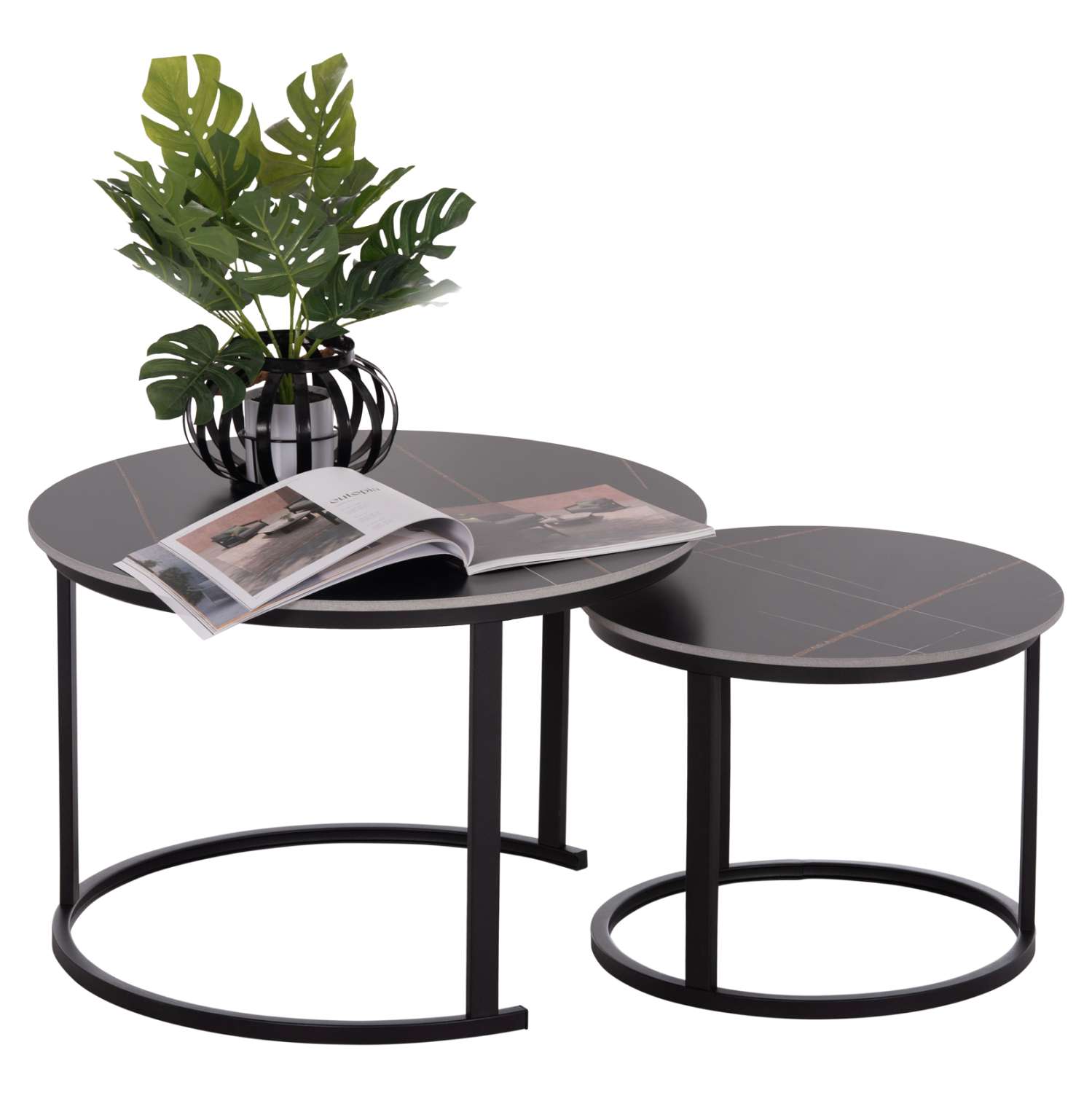 Τα τραπεζάκια FB918140.02 θα σας ενθουσιάσουν με το στυλ και την πρακτικότητά τους. Πρόκειται για 2 τραπεζάκια ένα ψηλότερο κι ένα πιο κοντό με ιδιαίτερο χαρακτηριστικό ότι το ψηλότερο στηρίζεται σε μια ημικυκλική βάση με τρία μεταλλικά πόδια, πράγμα που επιτρέπει στο πιο κοντό να χωράει και να αποθηκεύεται ακριβώς από κάτω. Οι βάσεις και των δύο τραπεζιών είναι μεταλλικές σε μαύρο χρώμα, ενώ οι επιφάνειές τους είναι κεραμικές σε χρώμα ΜΑΥΡΟΥ ΜΑΡΜΑΡΟΥ.