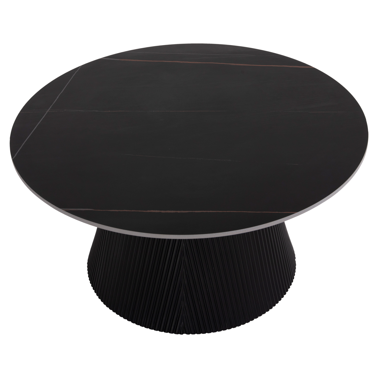 Το τραπέζι σαλονιού FB918022.01 είναι στρογγυλό και χαμηλό σχετικά τραπέζι σε χρώμα ΜΑΥΡΟ. Η επίπεδη επιφάνειά του είναι κεραμική σε χρωματισμό ΜΑΥΡΟΥ ΜΑΡΜΑΡΟΥ μονταρισμένη σε mdf πάνελ, ενώ η βάση του είναι κωνική κατασκευασμένη εξολοκλήρου από mdf, με όμορφες πτυχώσεις.