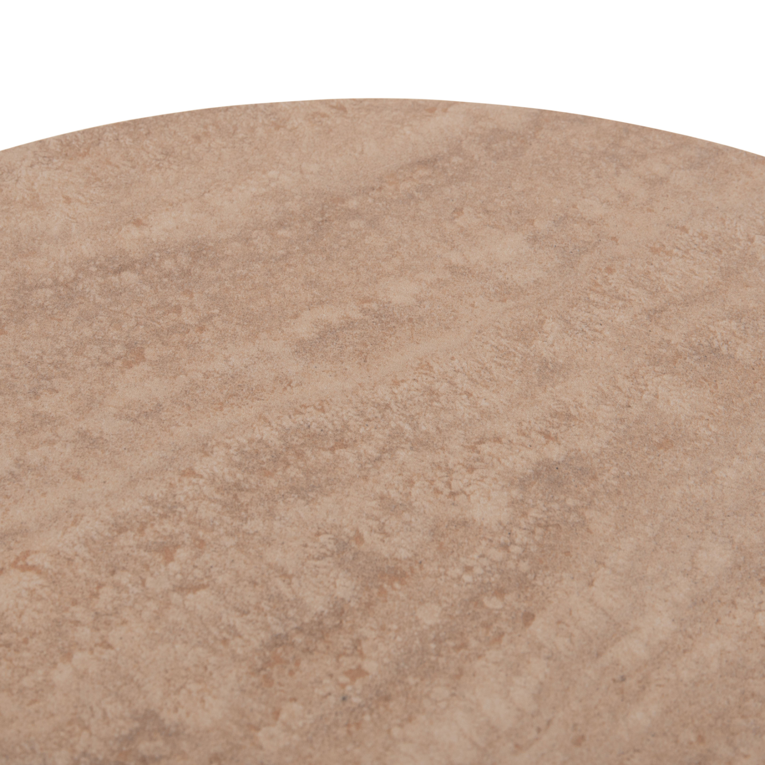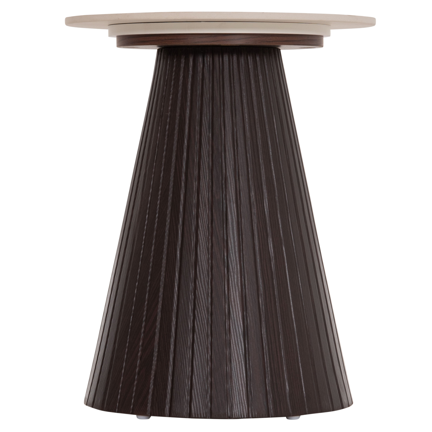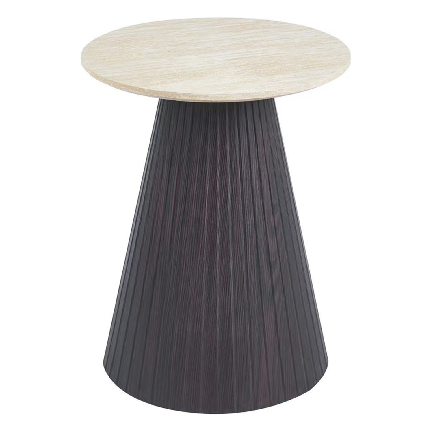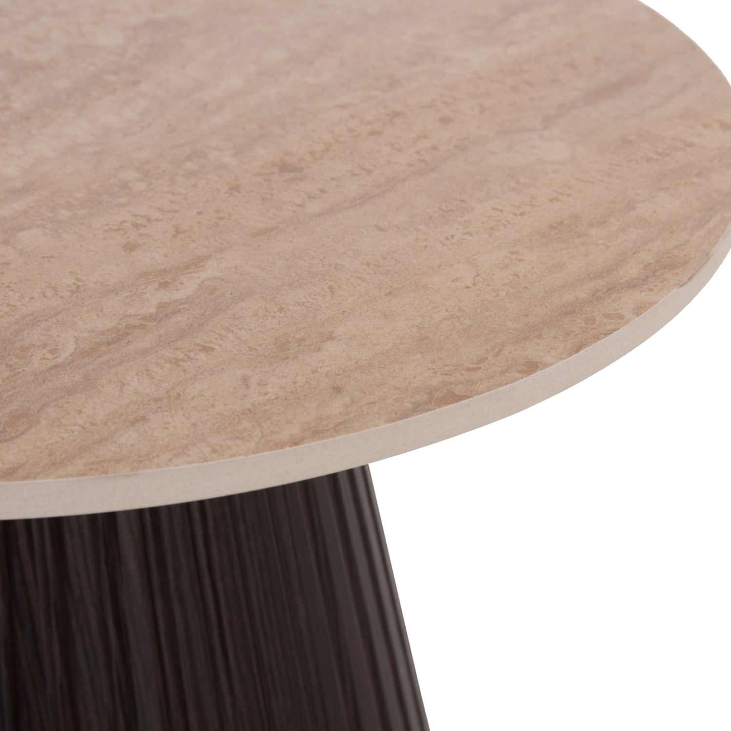 Το βοηθητικό τραπέζι FB918322 είναι στρογγυλό και αποτελεί νέα προσθήκη στην γκάμα μας. Η επίπεδη επιφάνειά του είναι κεραμική σε χρωματισμό TRAVERTINE STONE, ενώ η κωνική βάση του είναι κατασκευασμένη εξολοκλήρου από MDF σε χρώμα ΣΚΟΥΡΟ ΚΑΦΕ, με όμορφες πτυχώσεις.