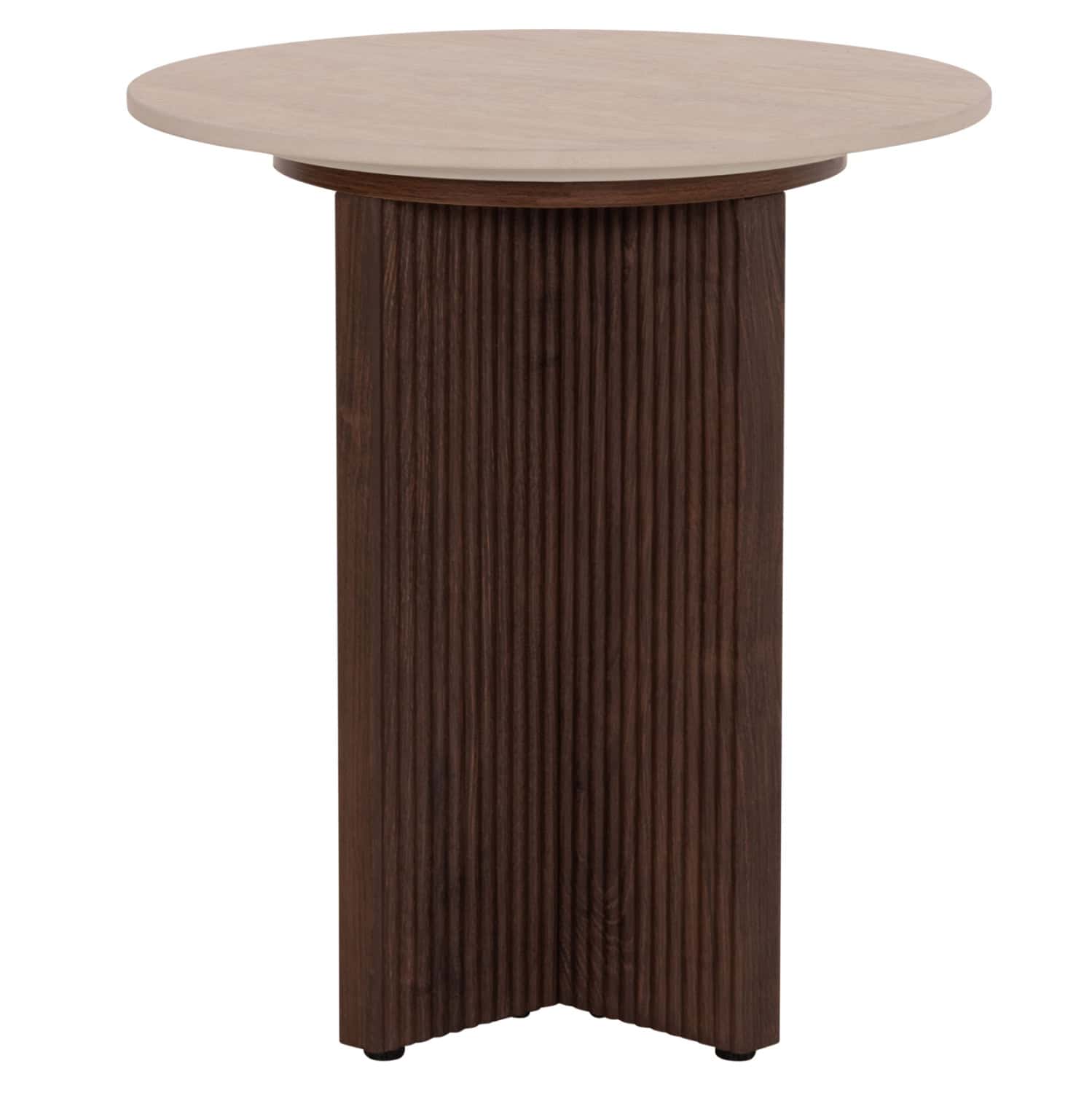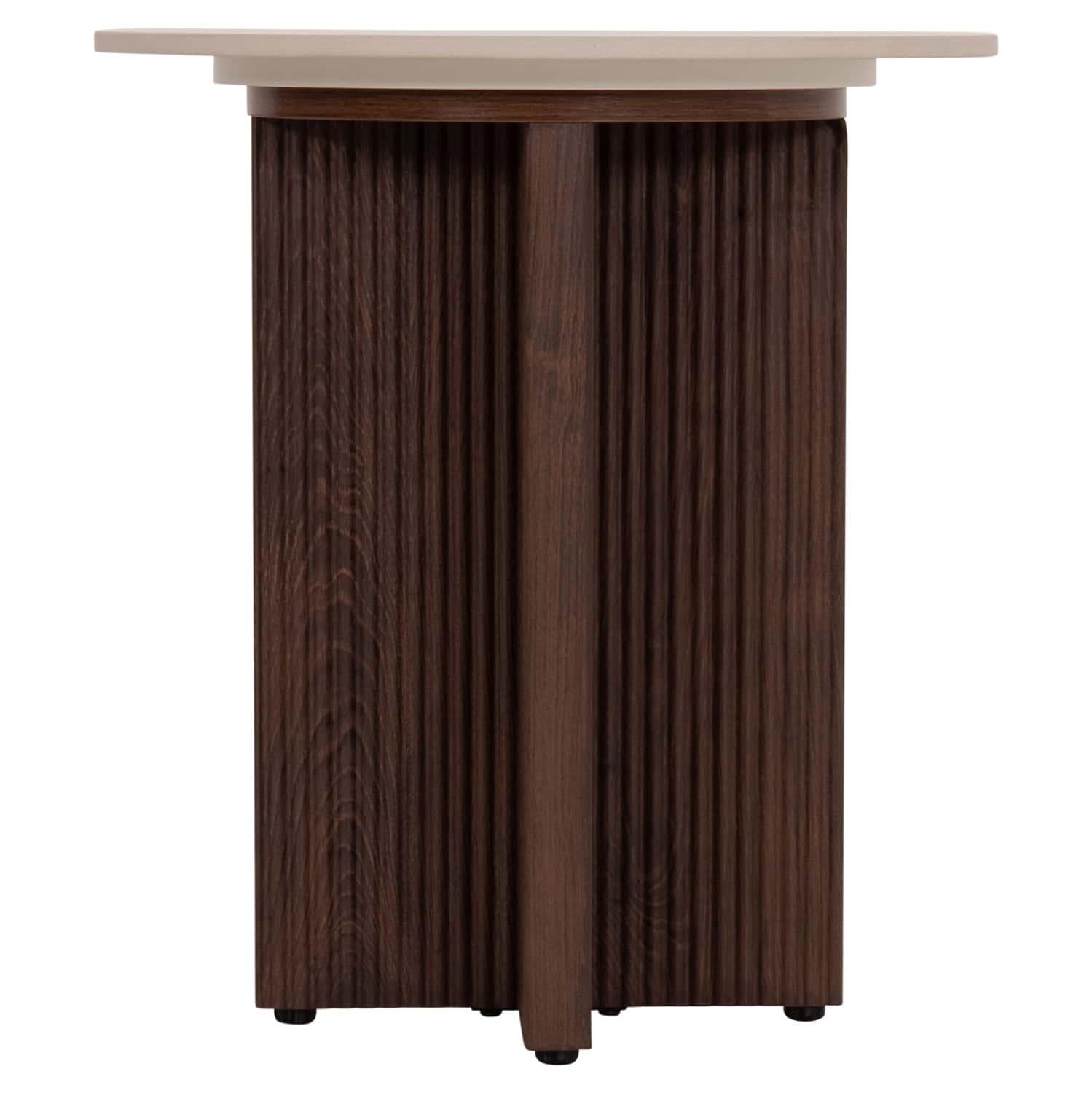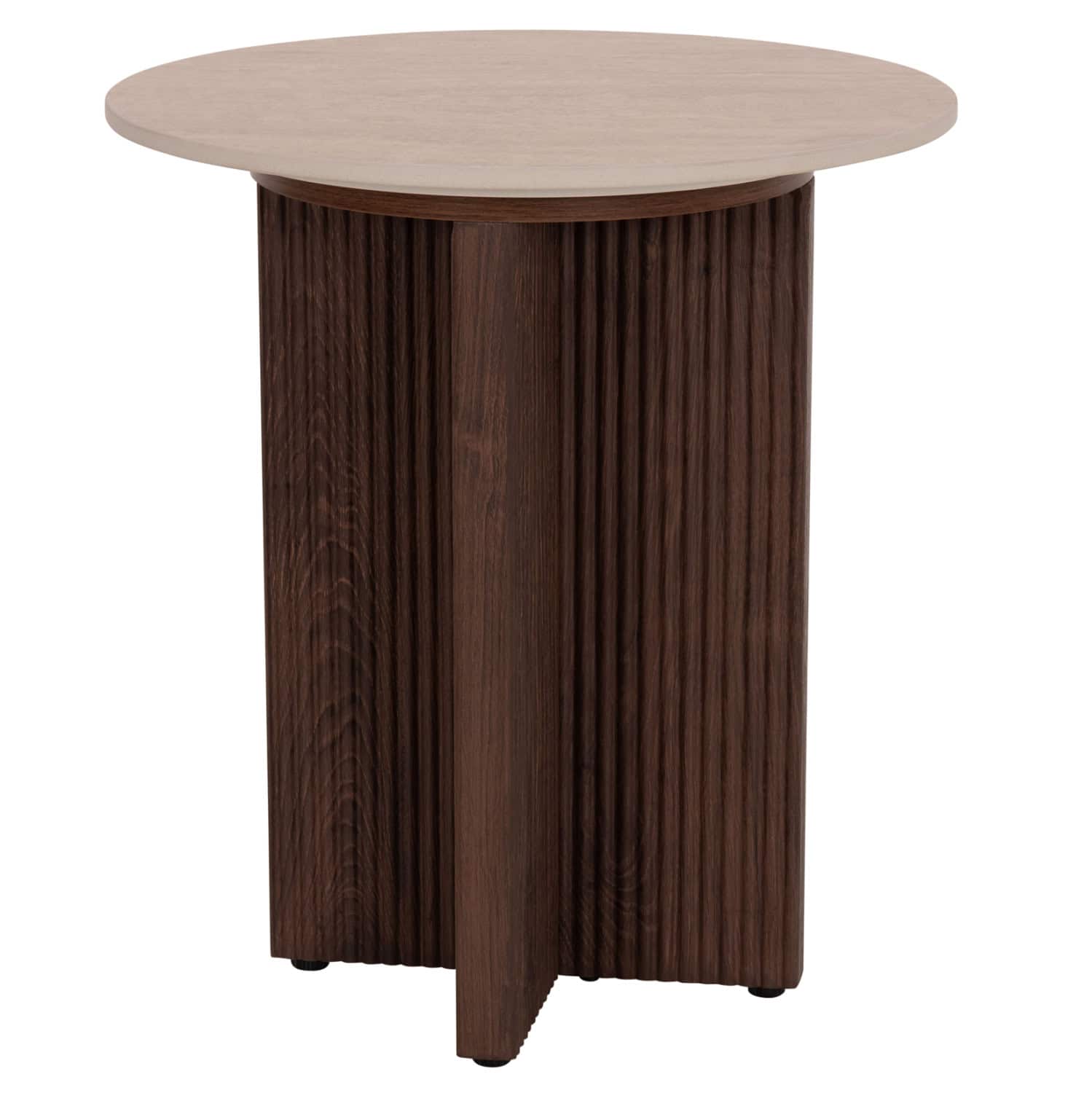 Το βοηθητικό τραπέζι FB918330 είναι στρογγυλό και αποτελεί νέα προσθήκη στην γκάμα μας. Η επίπεδη επιφάνειά του είναι κεραμική σε χρωματισμό TRAVERTINE STONE, ενώ η βάση του είναι σταυρωτή κατασκευασμένη εξολοκλήρου από MDF σε καφέ χρώμα, με όμορφες πτυχώσεις.