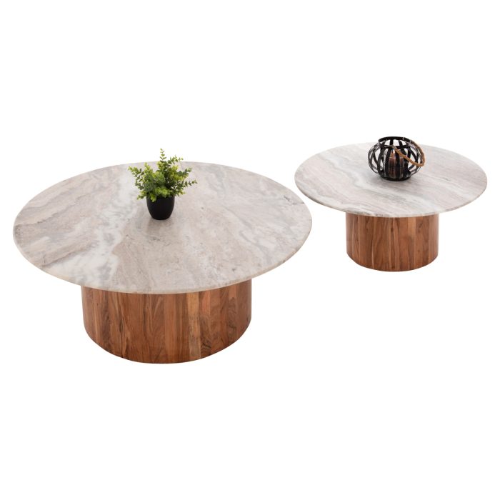 Το FB911915 είναι ένα σετ 2 τραπεζιών σαλονιού σε μεγάλη και μικρή διάσταση, που είναι από τις νέες προσθήκες στην γκάμα μας. Πρόκειται για ένα πολυτελές στρογγυλό τραπέζι με κυλινδρική ξύλινη βάση σε ΦΥΣΙΚΟ χρώμα ξύλου. Η επιφάνεια είναι από μάρμαρο σε διάφορους ανοιχτόχρωμους χρωματισμούς. Ο συνδυασμός είναι πραγματικά κάτι το μοναδικό και εντυπωσιακό. Ιδανικό τόσο για το σπίτι, όσο και για επαγγελματικούς χώρους.